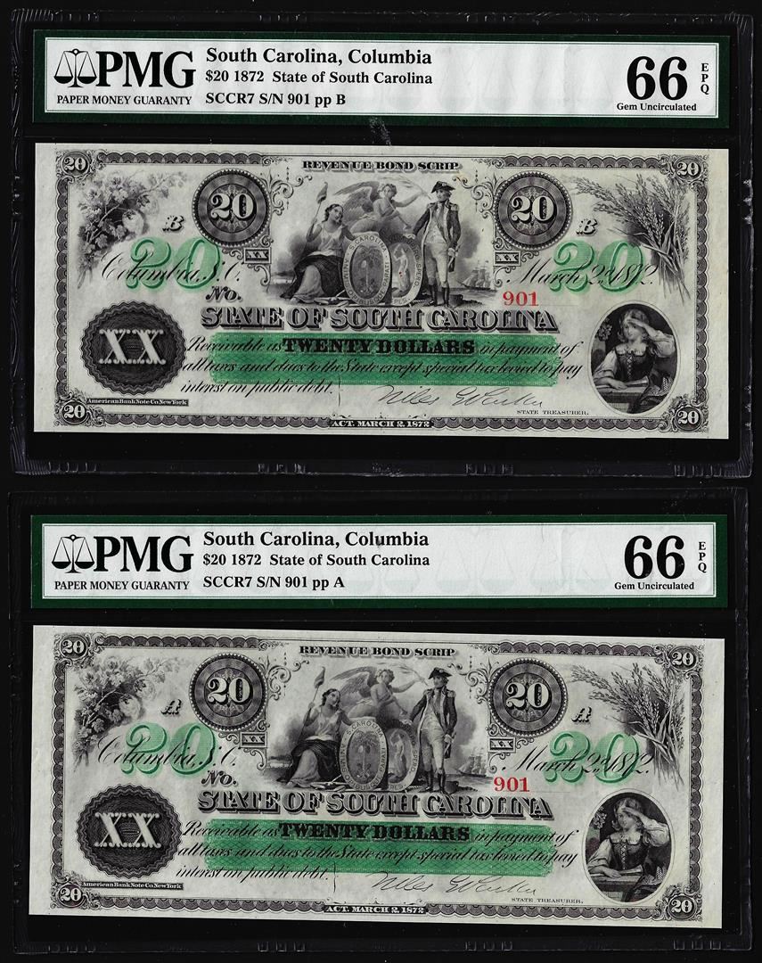 One Matching Low Serial 1872 $20 South Carolina Obsolete Notes PMG Gem Uncirculated 66EPQ. PMG Certified.