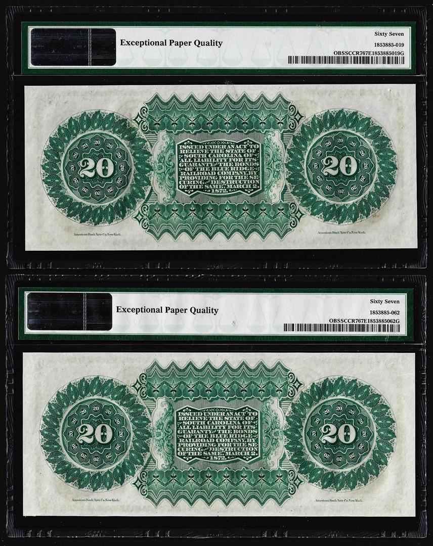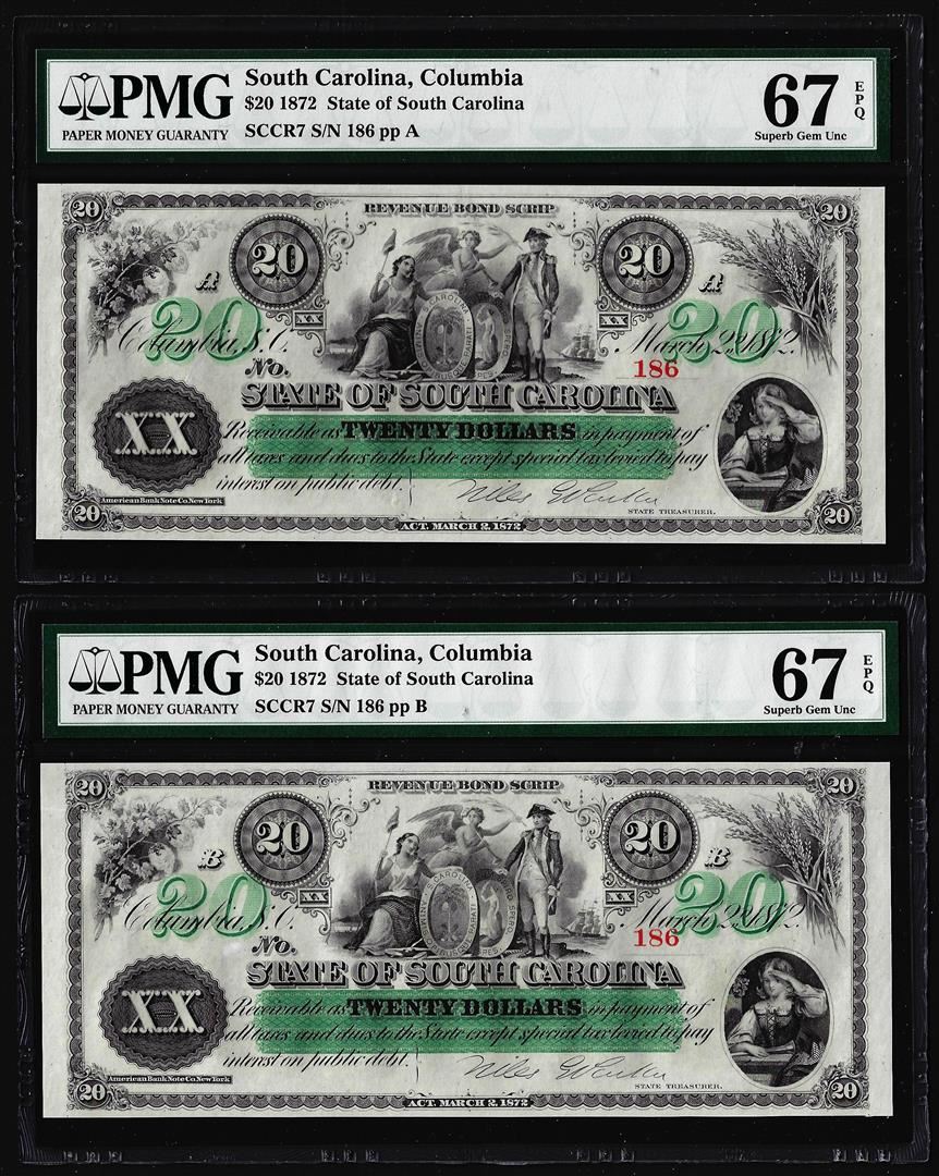 One Matching Low Serial 1872 $20 South Carolina Obsolete Notes PMG Superb Gem Uncirculated 67EPQ. PMG Certified.