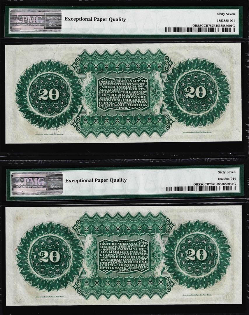 One Matching Low Serial 1872 $20 South Carolina Obsolete Notes PMG Superb Gem Unc. 67EPQ. PMG Certified.