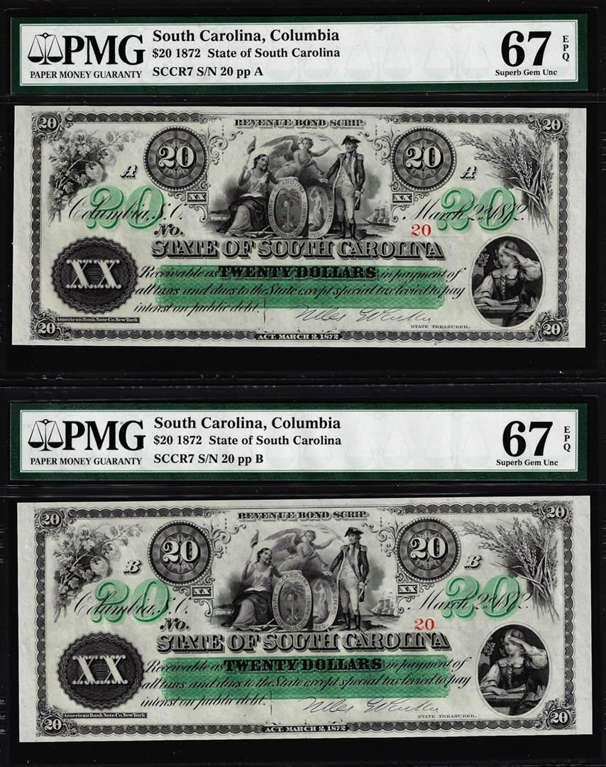 One Matching Low Serial 1872 $20 South Carolina Obsolete Notes PMG Superb Gem Unc. 67EPQ. PMG Certified.