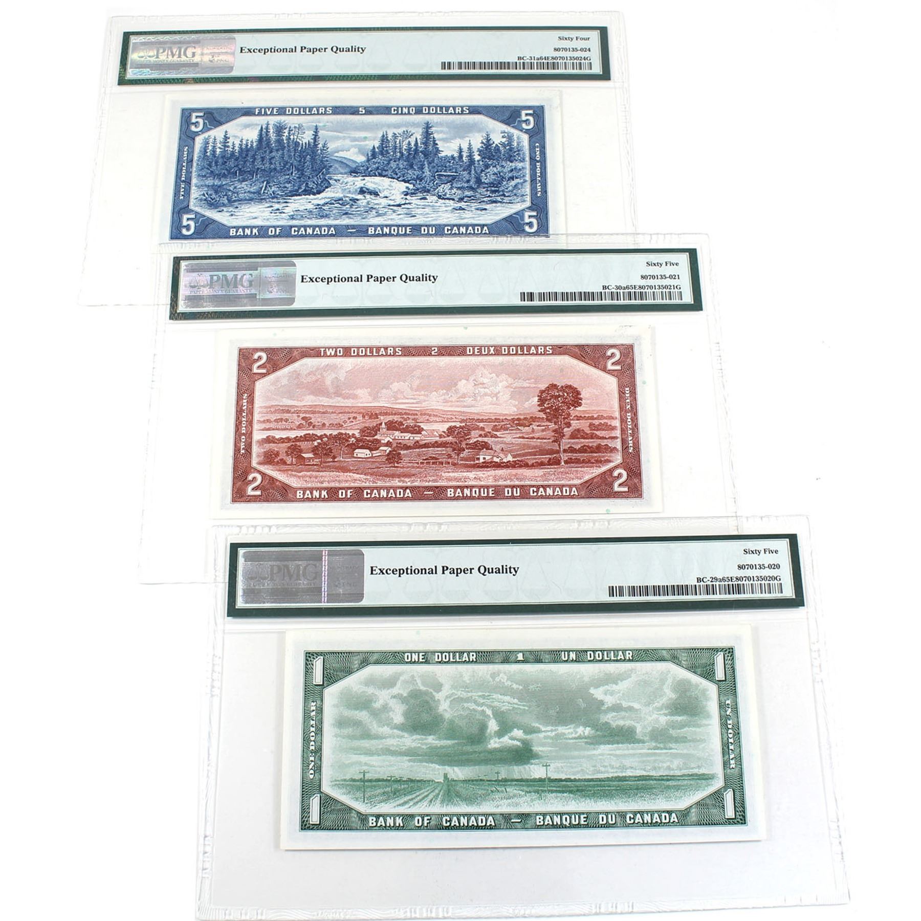 Originally purchased at the November 1999 Bank of Canada Sale, these Matching Low Serial Numbered notes (0000226) are a great investment opportunity seldom offered for sale. Lot includes the following PMG Certified, Coyne-Tower Signature Devil's Face Notes: $1 BC-29a, A/A Prefix, Gem UNC-65 EPQ, $2 BC-30a A/B Prefix, Gem UNC-65 EPQ, & $5 BC-31a A/C Prefix, Choice UNC-64 EPQ.