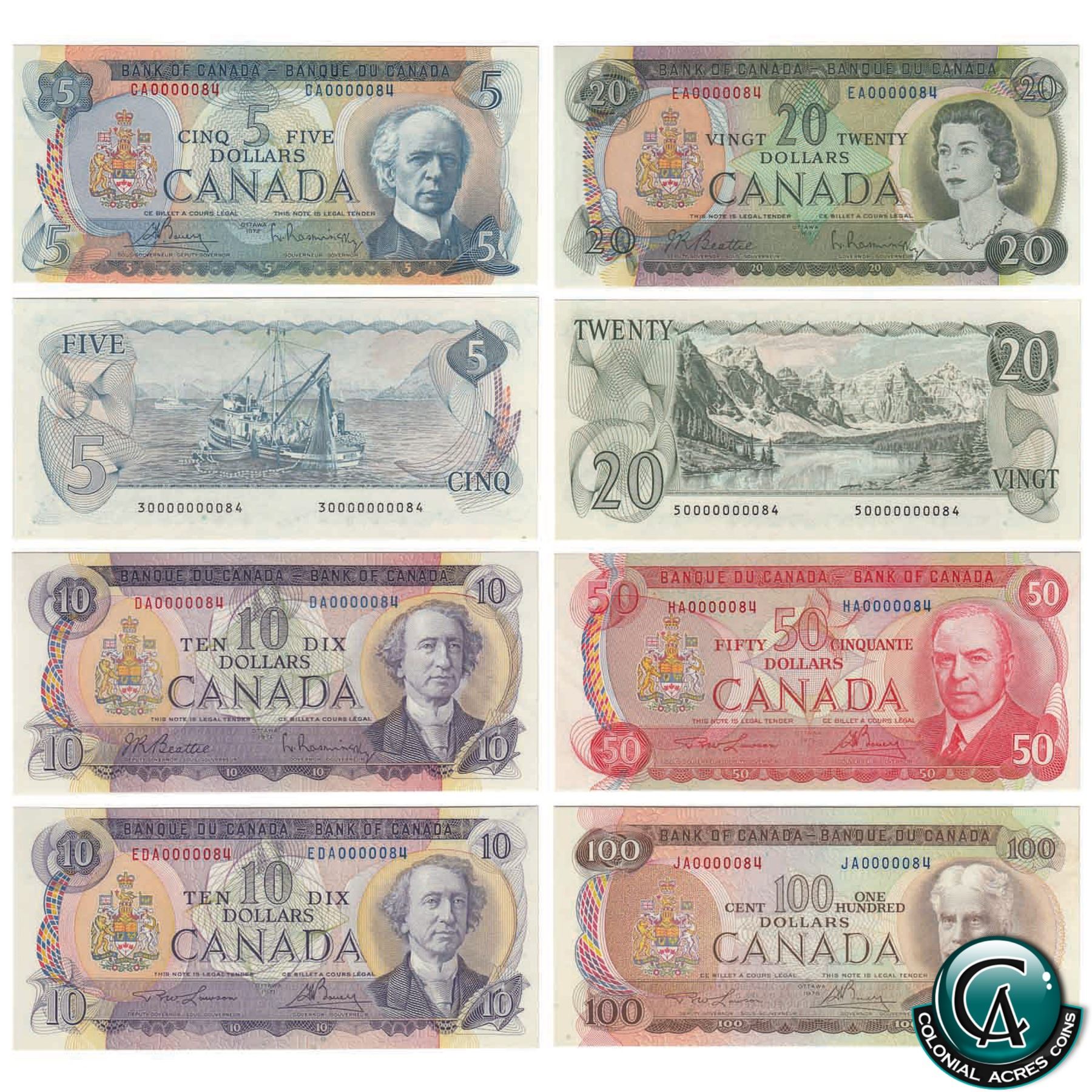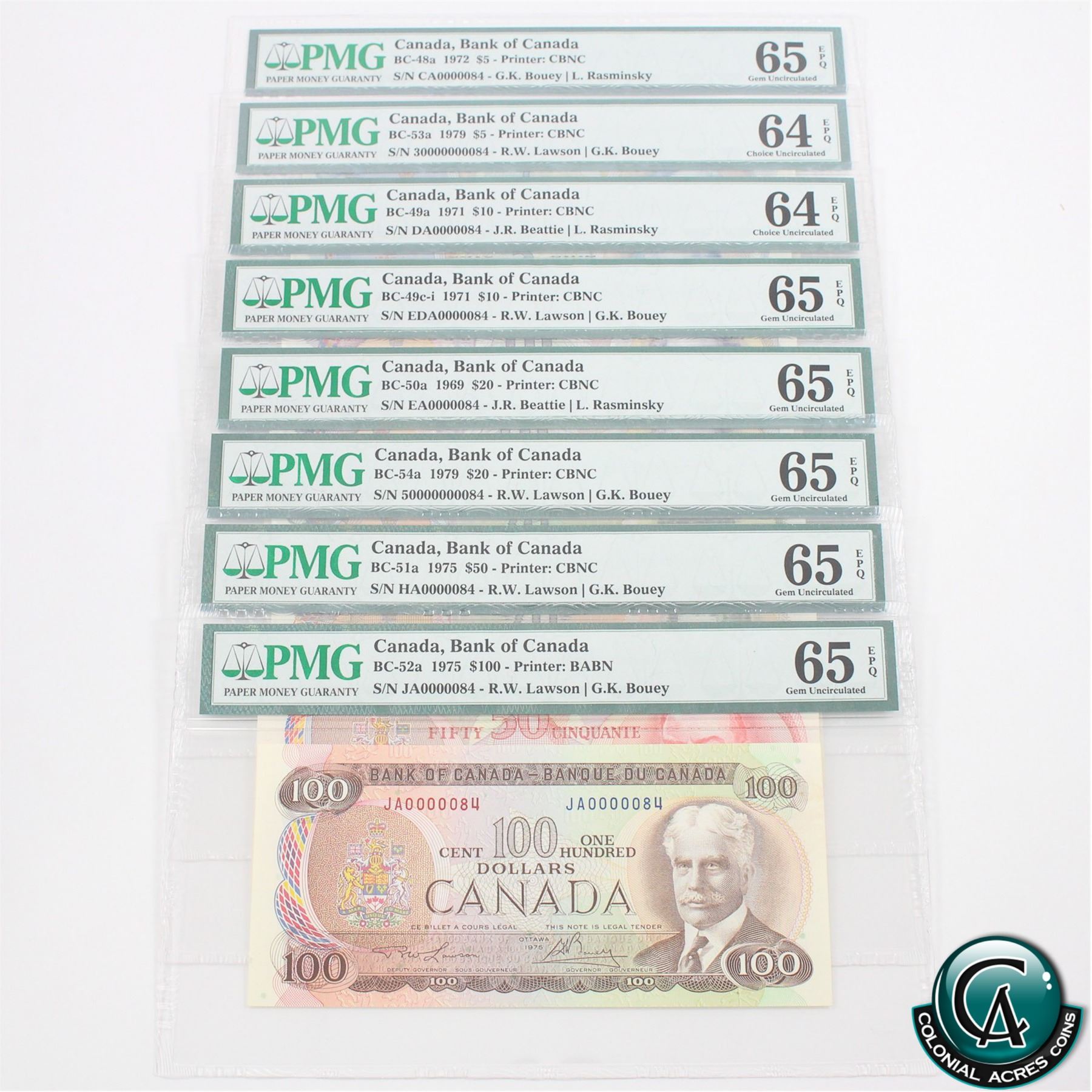 A very Unique Lot of the N5 Category in the Charlton. This matching Low Serial Number Set (0000084) contains 8 notes all PMG Certified Gem UNC-65 EPQ with the exception of 1 note that is CUNC-64 EPQ! (1979 $5) You will receive 1972 $5 Bouey-Rasminsky Prefix CA, 1979 $5 Lawson-Bouey Prefix 300, 1971 $10 Beattie-Rasminsky Prefix DA, 1971 Lawson-Bouey Prefix EDA, 1969 $20 Beattie-Rasminsky Prefix EA, 1979 $20 Lawson-Bouey Prefix 500, 1975 $50 Lawson-Bouey Prefix HA, & 1975 $100 Lawson-Bouey Prefix JA.