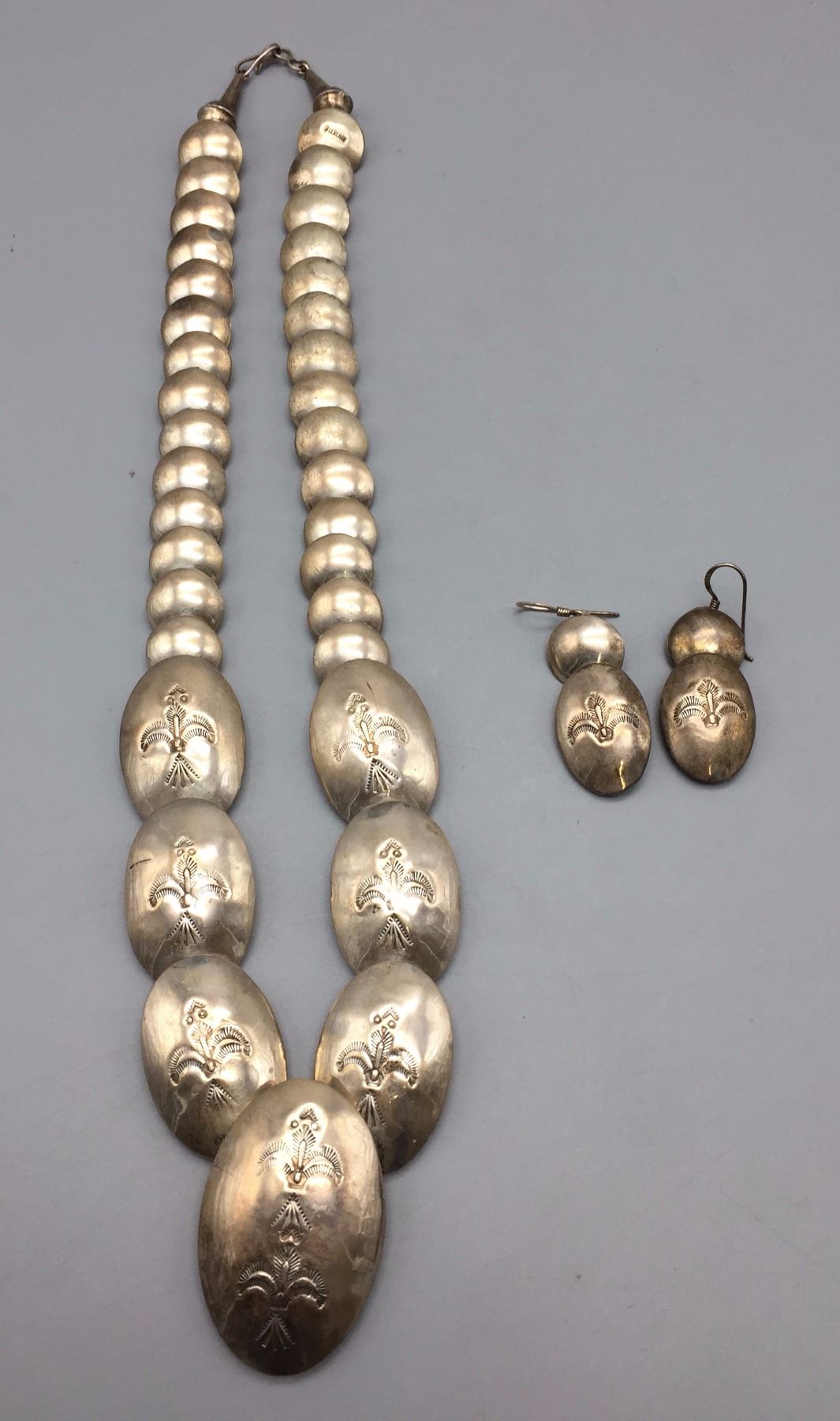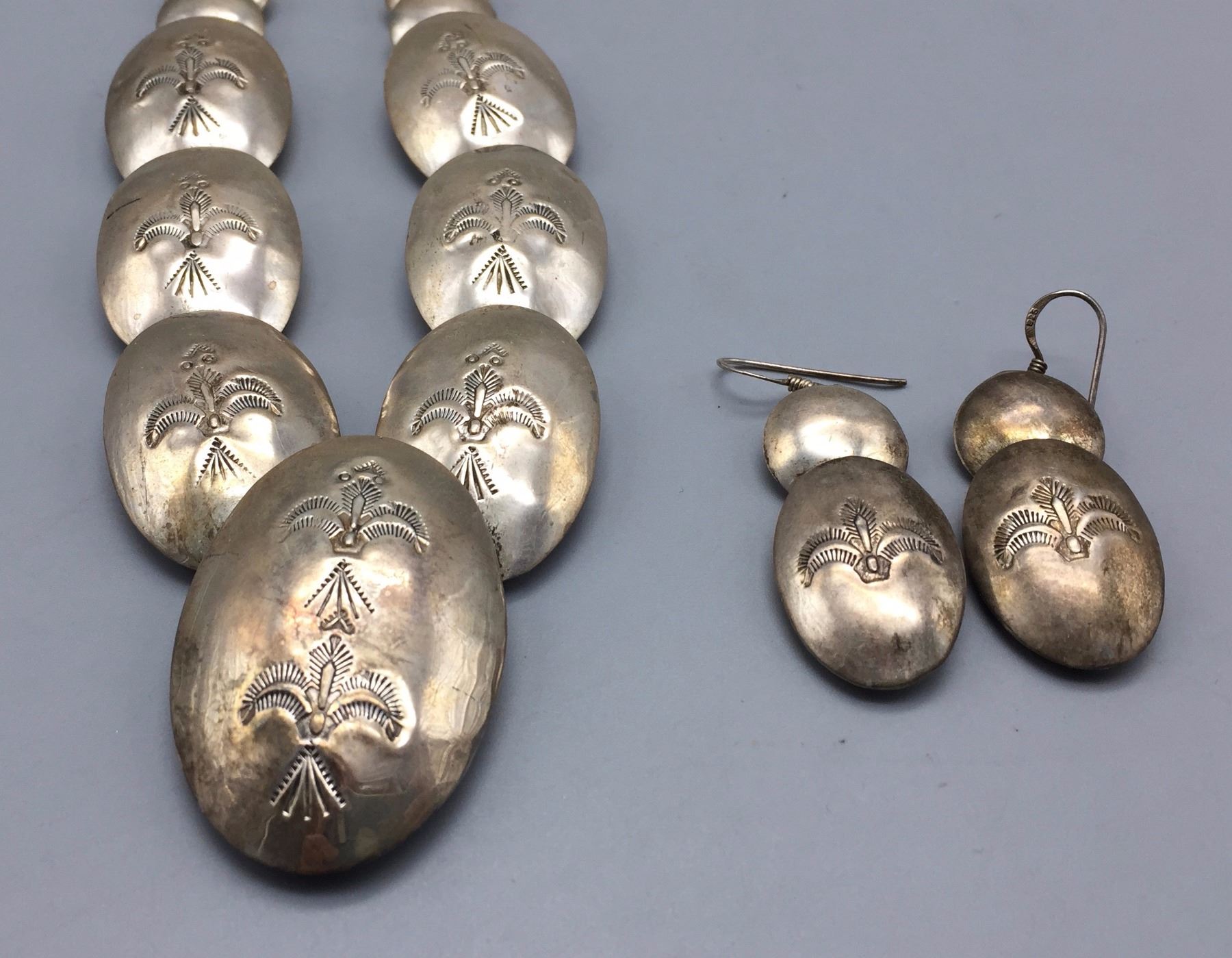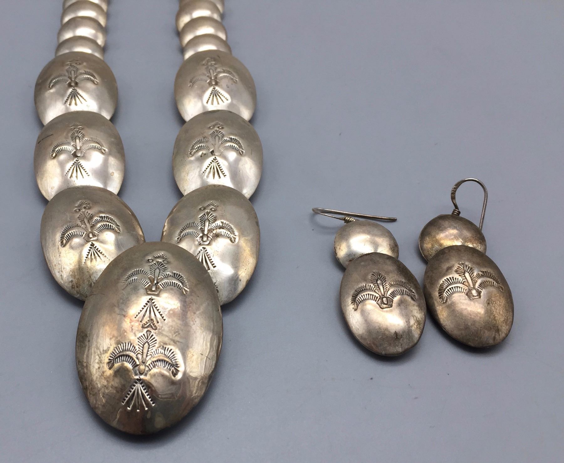Maker: Unknown but Navajo in style. Approx. Age: Circa 1970s - 80s. Size: Necklaces fits 20” around the neck. Earrings are 2” long. Set weighs 73.1 g. Additional Info: Matching necklace and earrings both are sterling silver. Condition: Good for its age, normal wear expected. Please look closely at the pictures - they are an important part of our description. Shipping: There will be a $5 handling / packaging fee for shipping this lot. The actual cost of postage will be added on top of that.