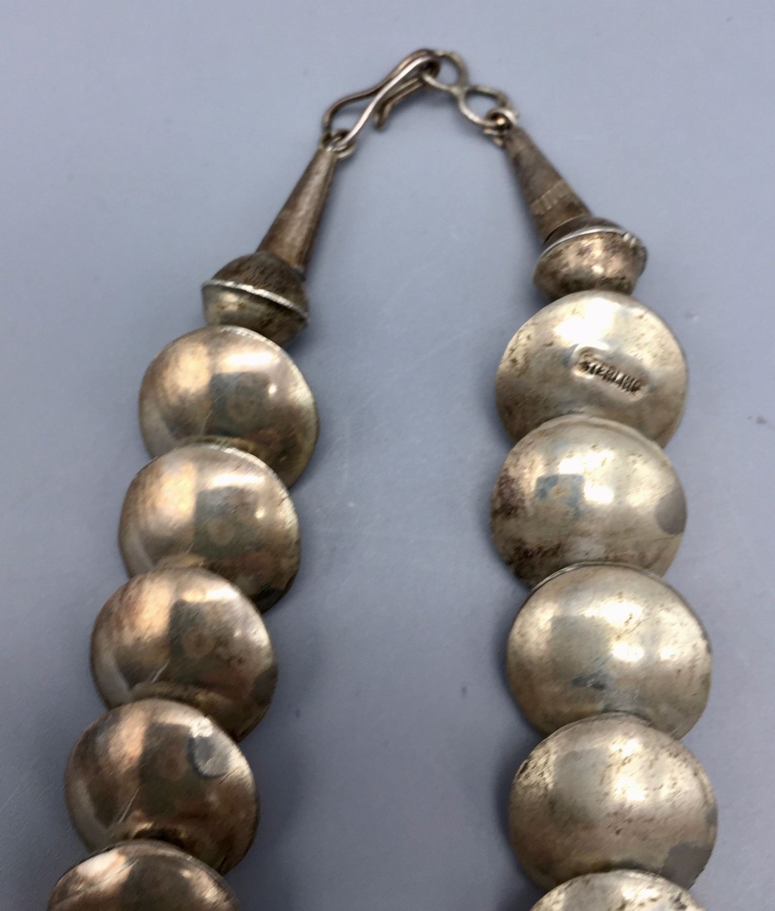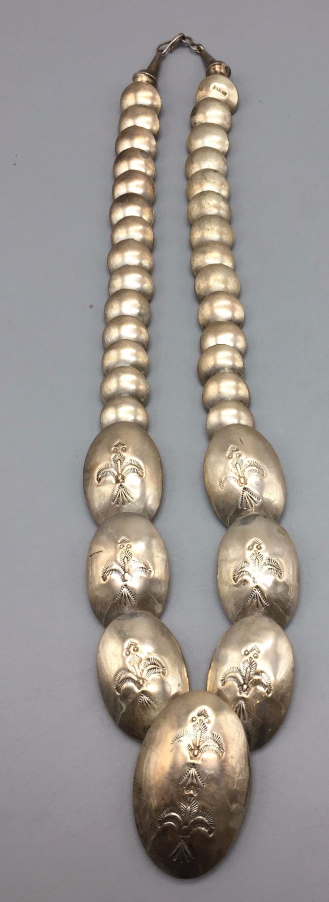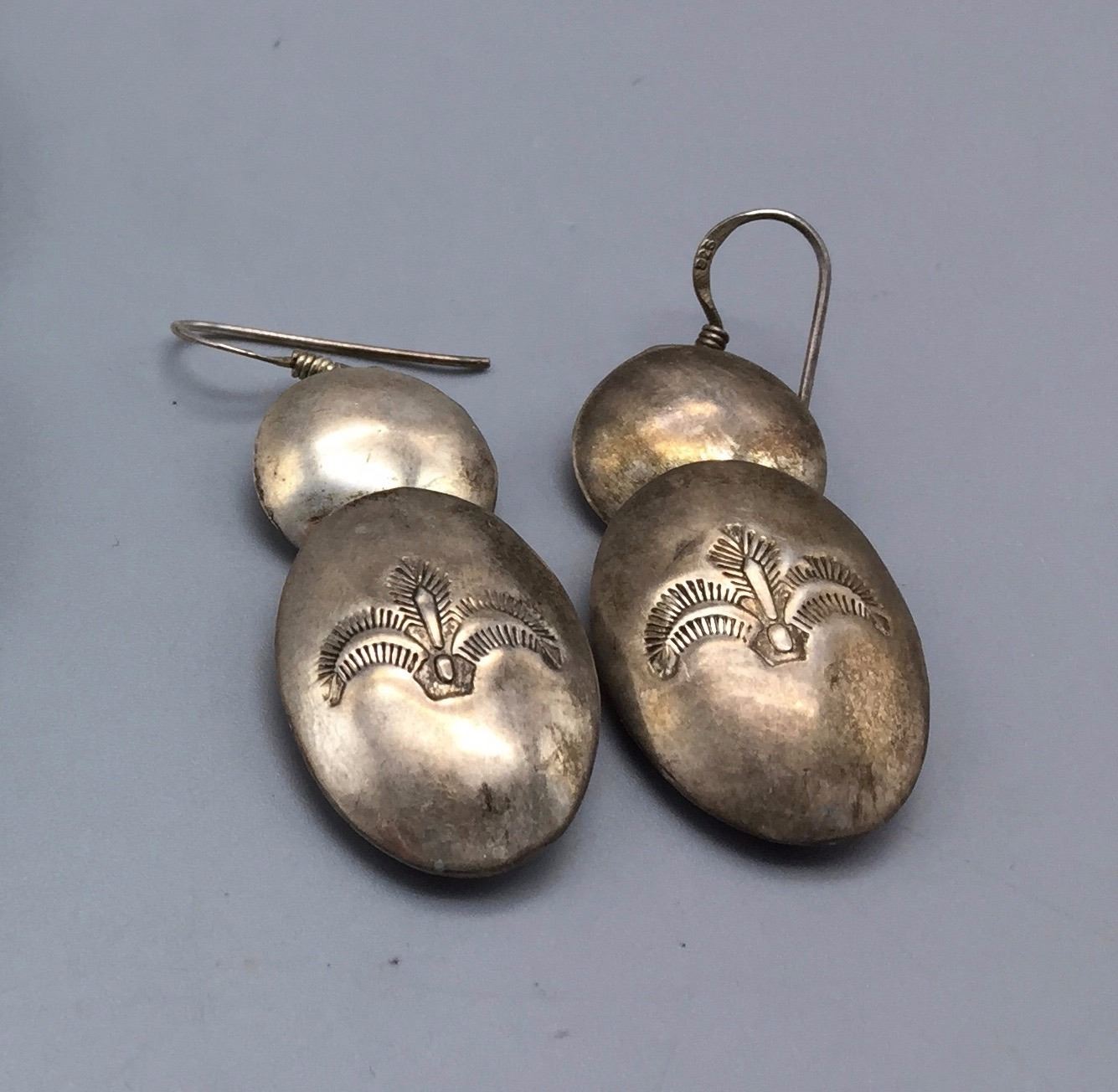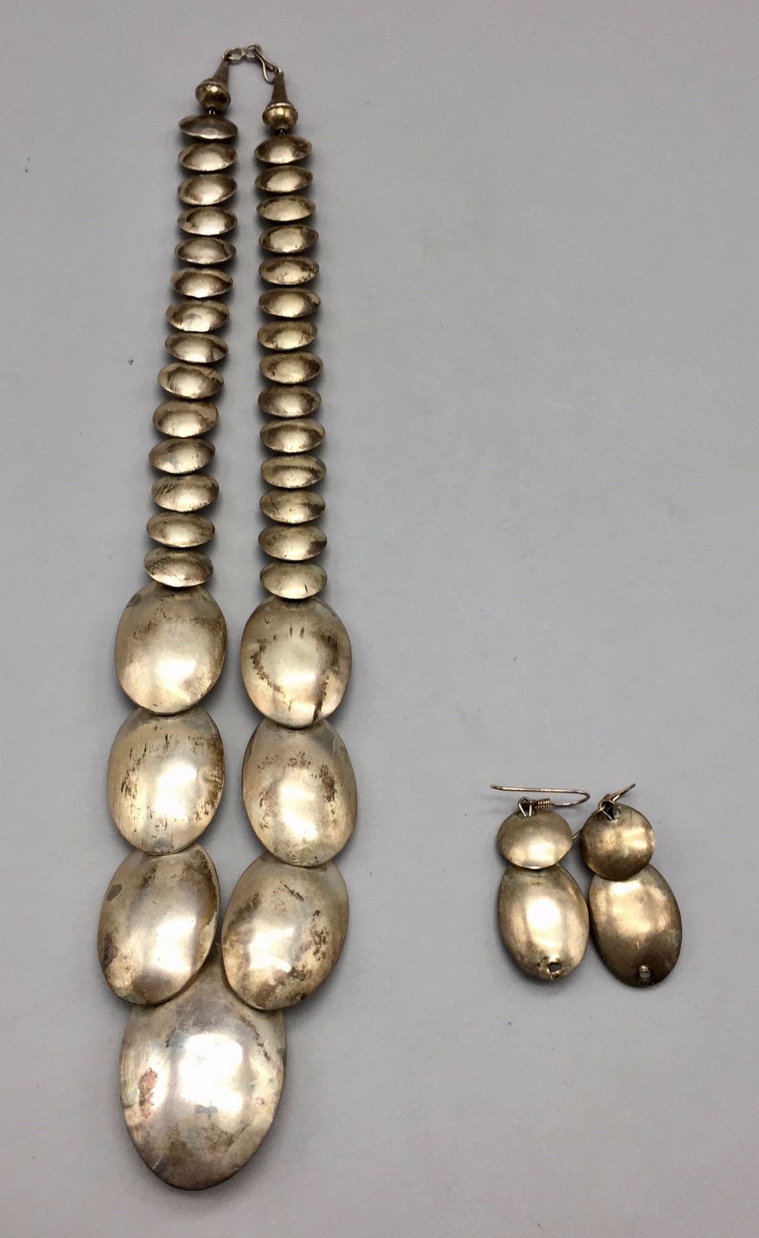 Maker: Unknown but Navajo in style. Approx. Age: Circa 1970s - 80s. Size: Necklaces fits 20” around the neck. Earrings are 2” long. Set weighs 73.1 g. Additional Info: Matching necklace and earrings both are sterling silver. Condition: Good for its age, normal wear expected. Please look closely at the pictures - they are an important part of our description. Shipping: There will be a $5 handling / packaging fee for shipping this lot. The actual cost of postage will be added on top of that.