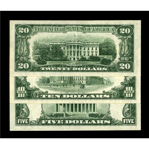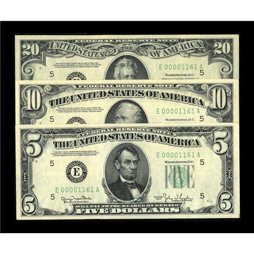 <B>1950 Matching Serial Number Set.</B></I><BR>This set last appeared at our 2004 FUN sale, where we described, "Three 1950 Federal Reserve Notes that form a neat and hard-to-replicate set, a Fr. 2059-E $5, Fr. 2010-E $10, and Fr. 1961-E $20, each bearing the matching serial number E00001161A. All three notes have a single light vertical storage fold and thus grade <B>Choice About Uncirculated</B></I>." <BR><I>From The Bill and Kathy Stella Currency Collection</B></I><BR><BR><b>Shipping:</b> Coins & Currency (<a target="_blank" href="http://www.heritageauctions.com/common/shipping.php">view shipping information</a>)