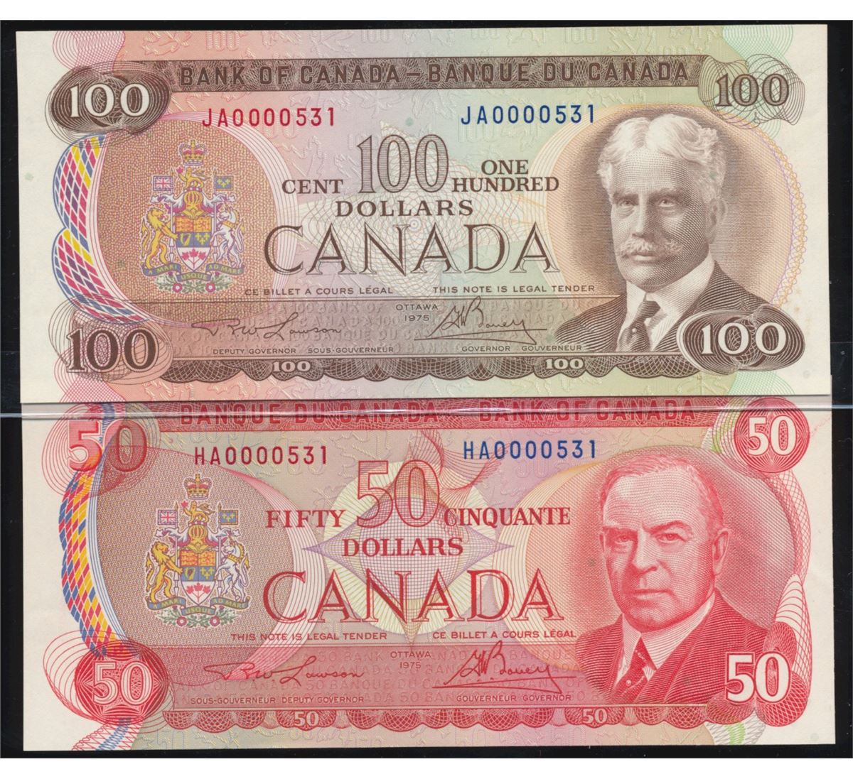 Matching Serial Numbers; 1975 $50 BC-BC-51a #HA0000531 & $100 BC-52a #JA0000531. Lot of 2 notes both AU/UNC original.