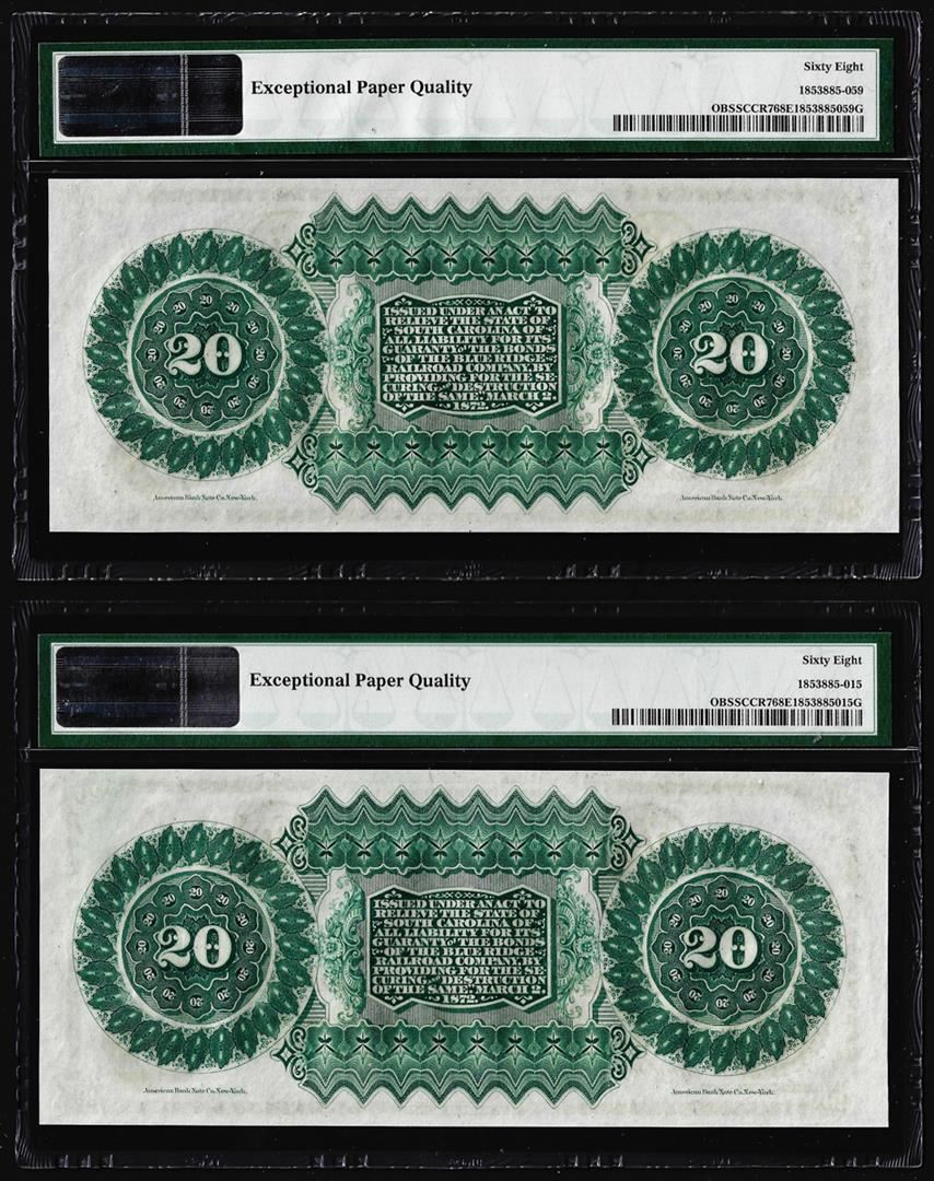 One Matching Serial Set- 1872 $20 South Carolina Obsolete Notes PMG Superb Gem Unc. 68EPQ. PMG Certified.