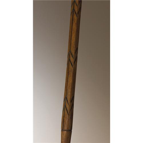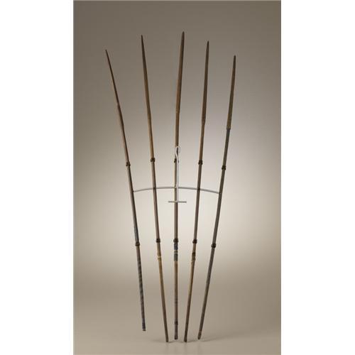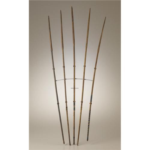 <B>Matching Set of Five Southern Plains Arrows</B></I><BR>Circa 1880<BR>Length 27 1/2 in. the longest<BR><BR>Each arrow is delicately engraved, then painted in red. Two are engraved with lightning bands, two with designs suggesting arrow points, and one with two lances - one on each side of the long, narrow point.<BR>These rare arrows can be favorably compared with several examples in the literature. A single arrow pictured as figure 3, plate XLIV in <I>North American Bows, Arrows, and Quivers</B></I> is identified as a "Gambling arrow of the Apache Indians". After a brief description, the author states "Used in divination and gambling". A similar group of five carved and engraved arrows is in the Brooklyn Museum collections. They are pictured in <I>Objects of Myth and Memory,</B></I> p. 19, and described as "Kiowa arrows made by F.H. Cushing". Frank Hamilton Cushing (1857-1900) was a pioneer ethnologist who lived with the Zuni from 1879-1884. Cushing and Stewart Culin, curator of the Brooklyn Museum, were great friends and "From Washington, Cushing provided inspiration, encouragement, and most important, examples of games and arrows, many made with his own hands". A third reference can be found in <I>Bows, Arrows, and Quivers of the American Frontier,</B></I> p. 40. This single engraved arrow is identified as Cheyenne. (Note: The Apache example from <I>North American Bows, Arrows, and Quivers</B></I> is illustrated on page 34 of this book.)<BR><BR>Provenance<BR>Richard Corrow Collection, Santa Fe, New Mexico.<BR><BR>References<BR>Mason, Otis Tufton. <I>North American Bows, Arrows, and Quivers.</B></I> Washington: Smithsonian Report for 1893. Government Printing Office, 1894. Plate XLIV.<BR>Fane, Diane, Jacknis, Ira, and Breen, Lise. <I>Objects of Myth and Memory.</B></I> The Brooklyn Museum, 1991, pp. 16-19.<BR>Baldwin, John. <I>Bows, Arrows, and Quivers of the American Frontier,</B></I> West Olive, Michigan: Early American Artistry Trading Compan