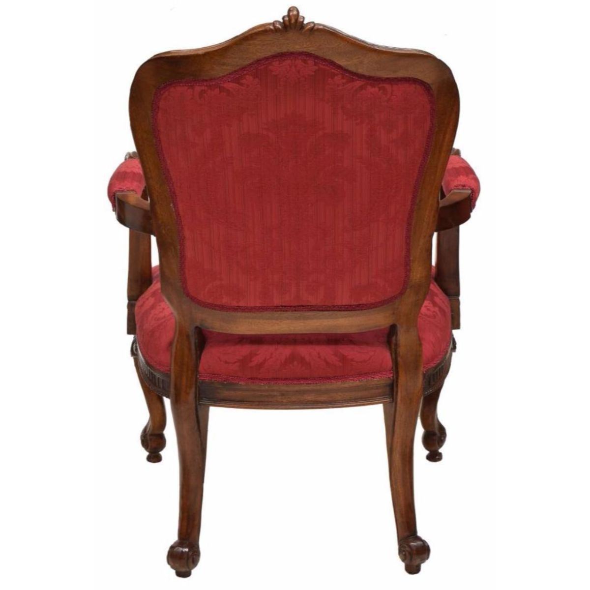 Early 20th matching set of four Louis XV style fauteuils, armchairs, having an arched shell crest rail over red on red foliate patterned back & seat, padded arms with scrolled handholds, rising scroll foot cabriole legs, 42"H, 27"W, 23" D.