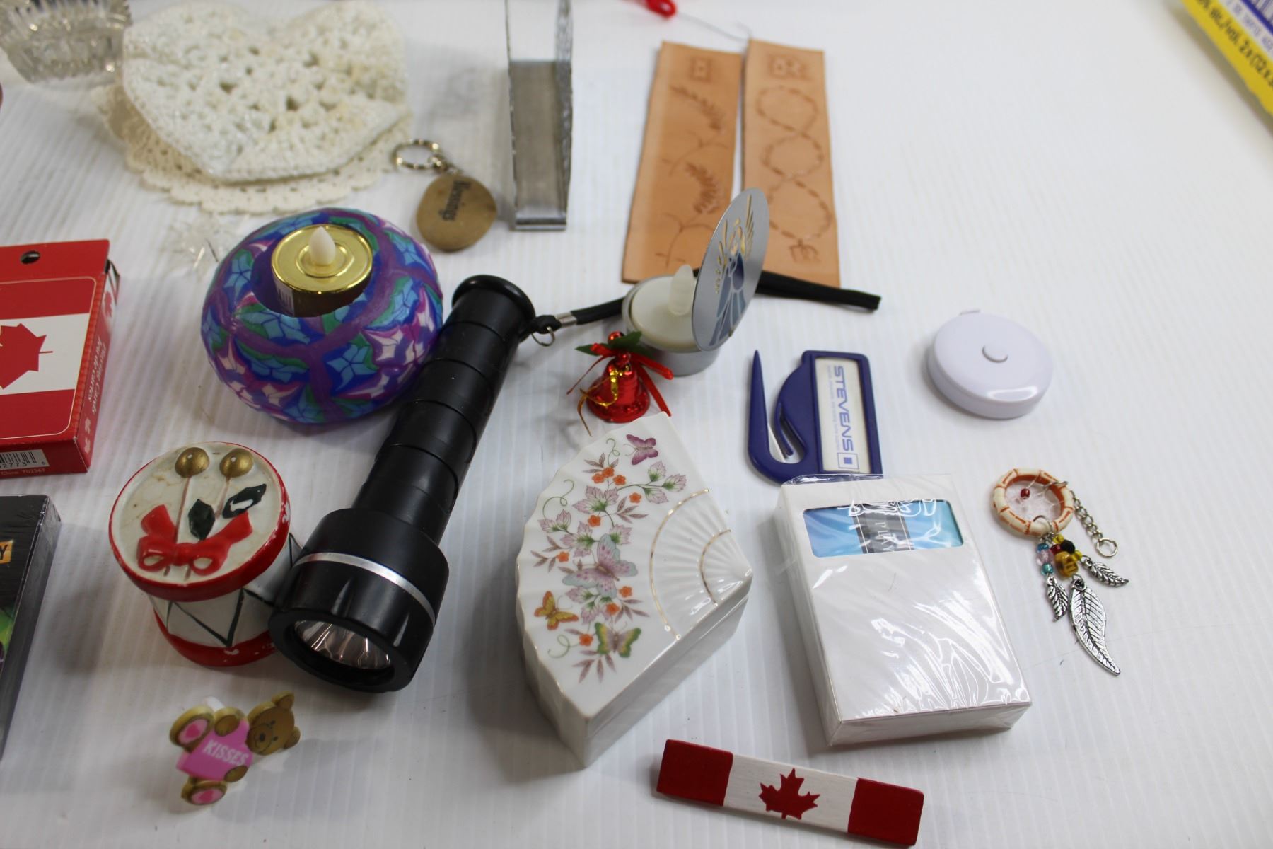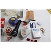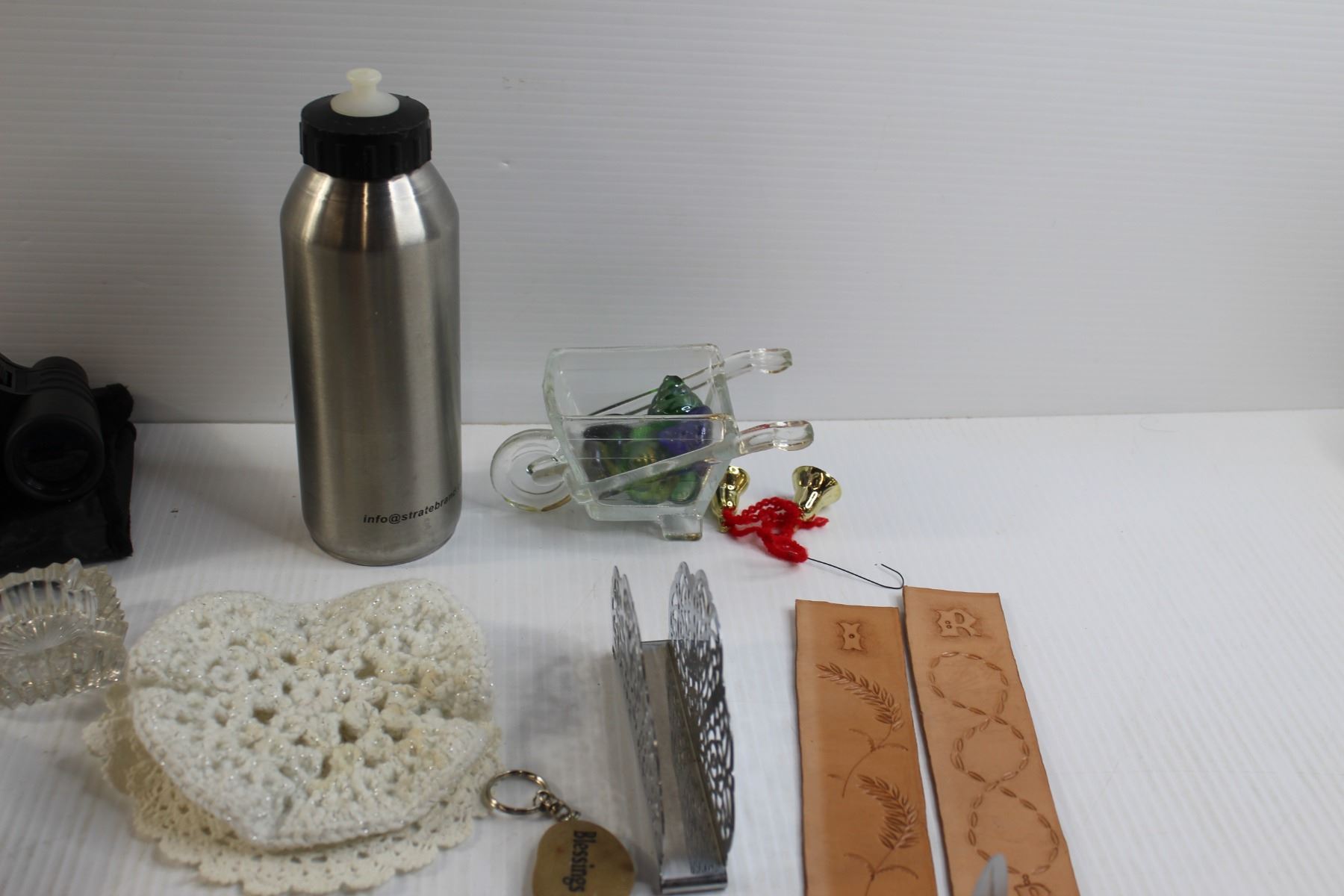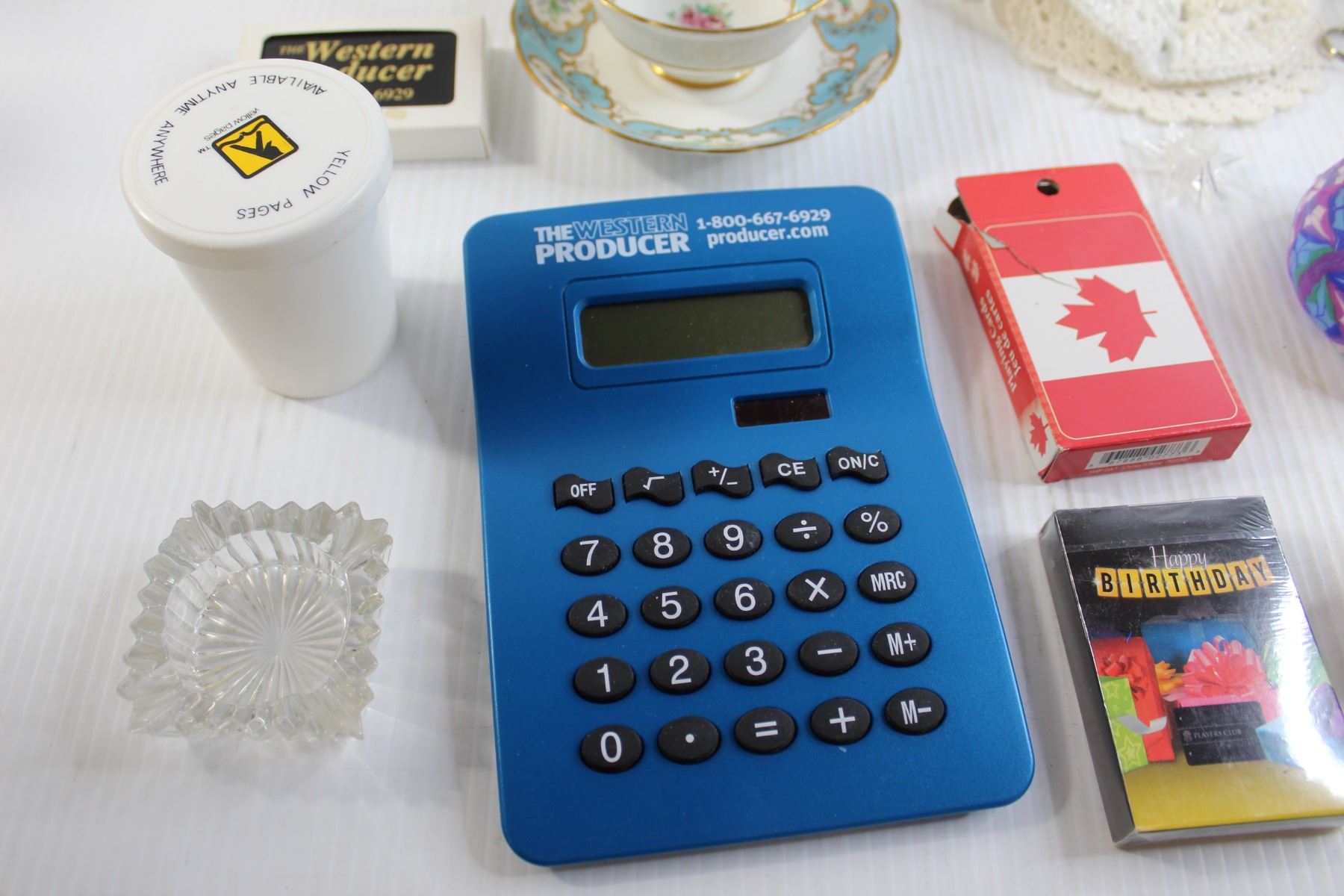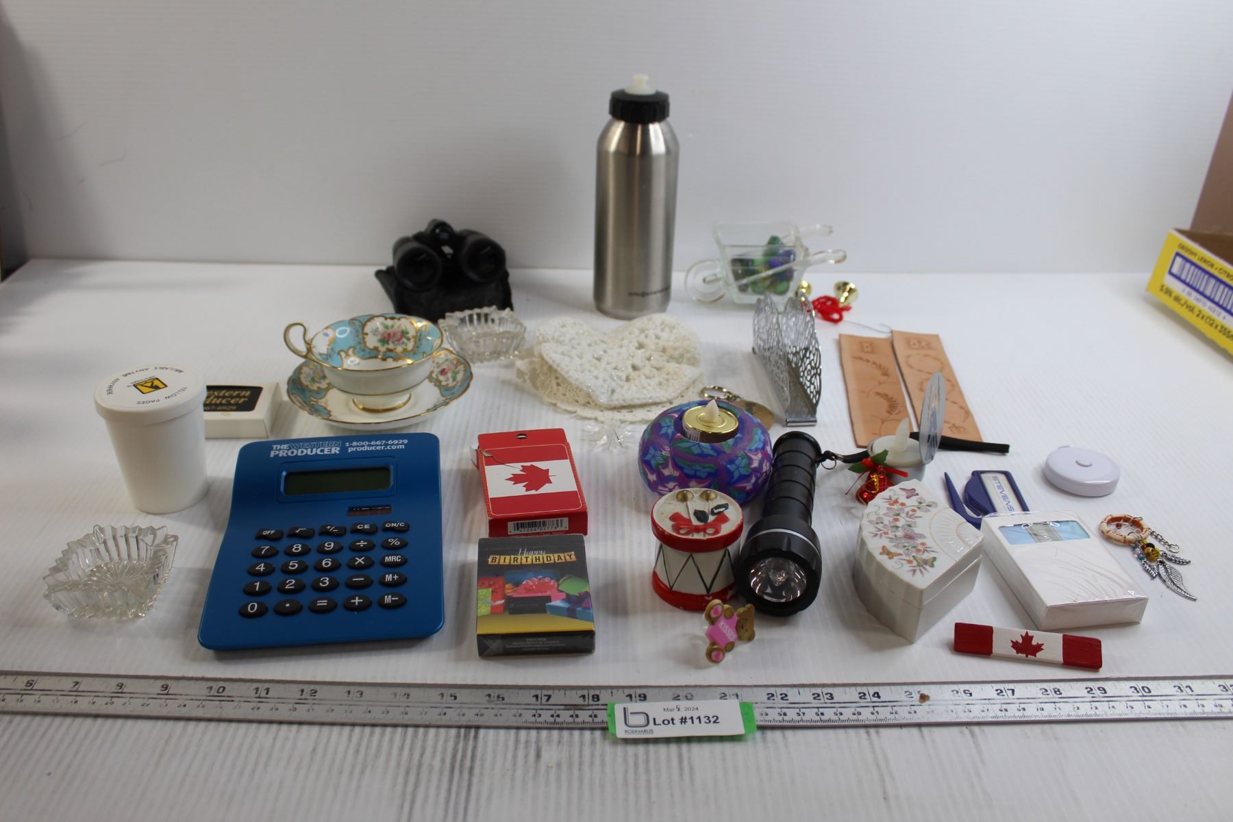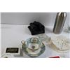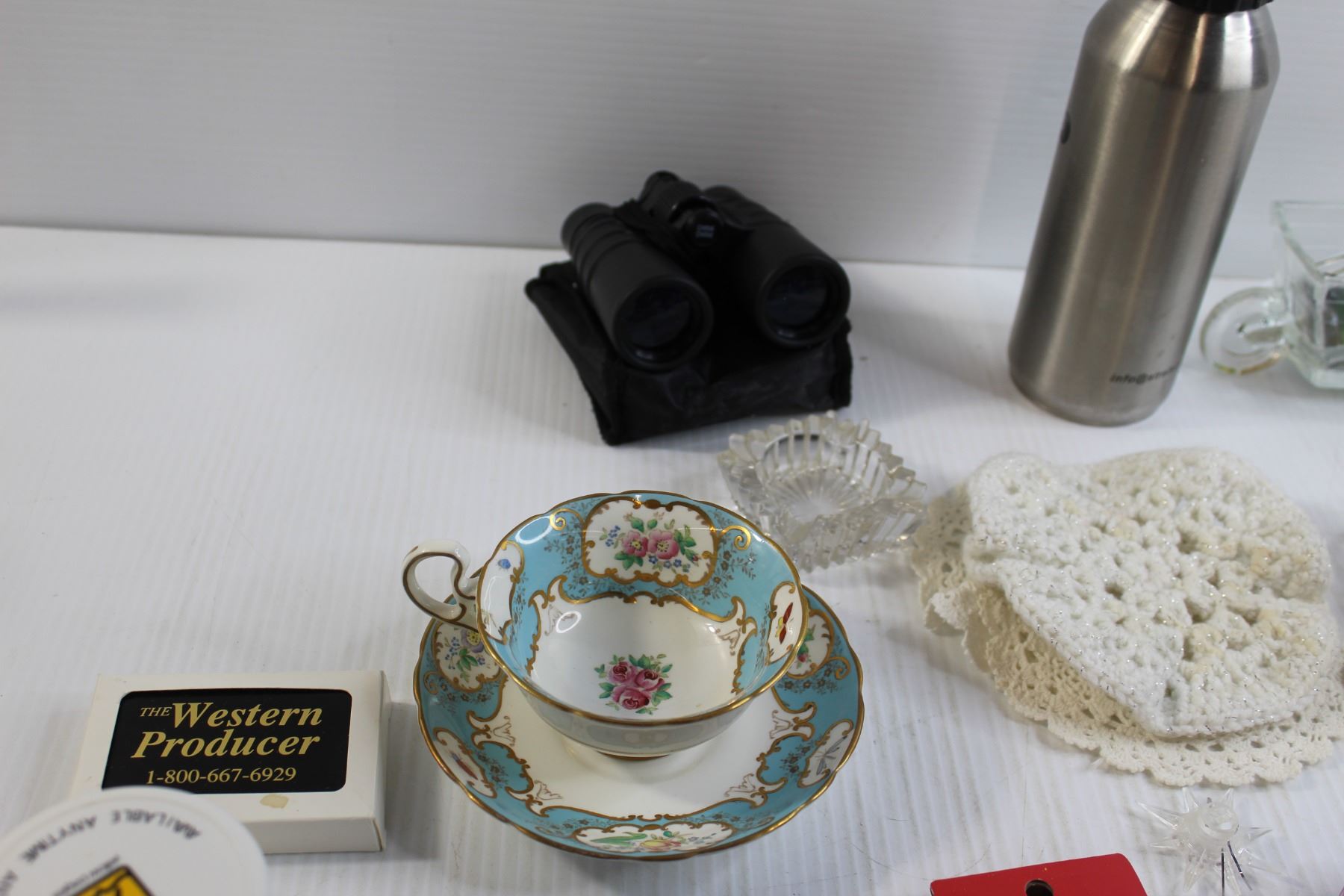 Matching Teacup and Saucer, Binoculars, Assorted Trinkets