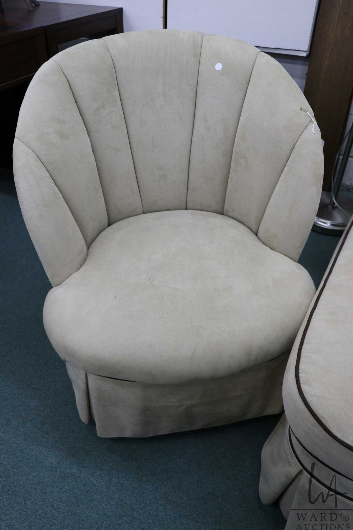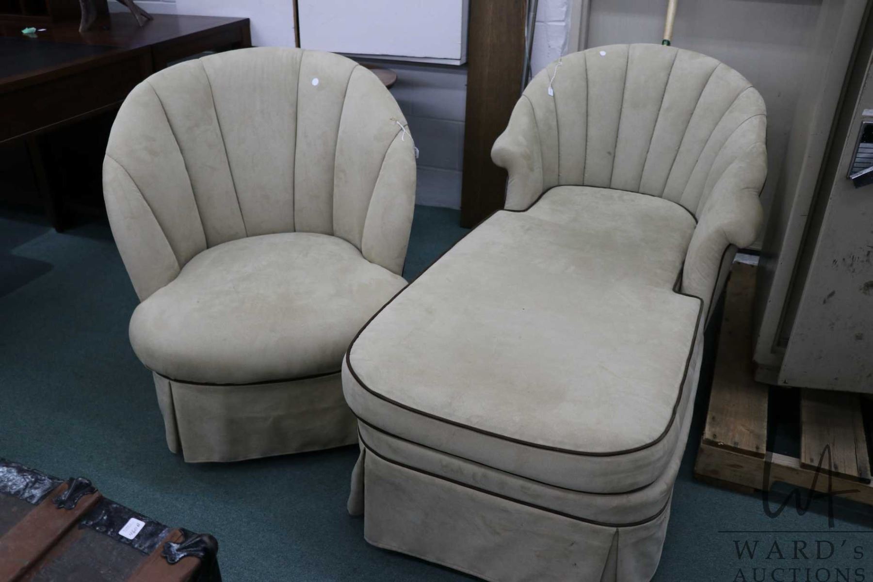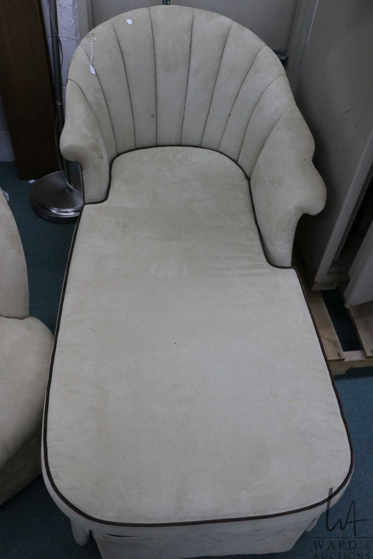 Matching chaise lounge and boudoir chair each channel backed with brown piping