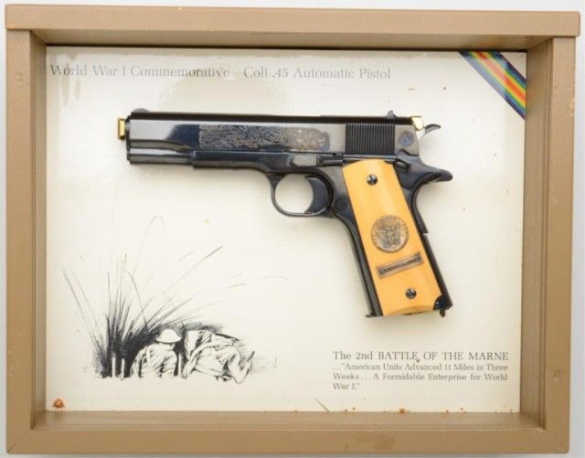 Matching serial numbers set of four cased WW I Battle Commemorative Model 1911 semi-auto pistols made up of the following items: 1). The “Meuse-Argonne Offensive”, #6809-MA; 2). The “Battle of Chateau-Thierry”, #6809-CT;3). The “2nd Battle of the Marne”, #6809-M2; 4). The “Battle of Belleau Wood”, #6809-BW; all in excellent condition showing little handling; a hard-to-find set in this condition and with matching serial numbers as over the years, this Commemorative series has been often broken up and sold separately by collectors. Est.: $3,000-$6,000.