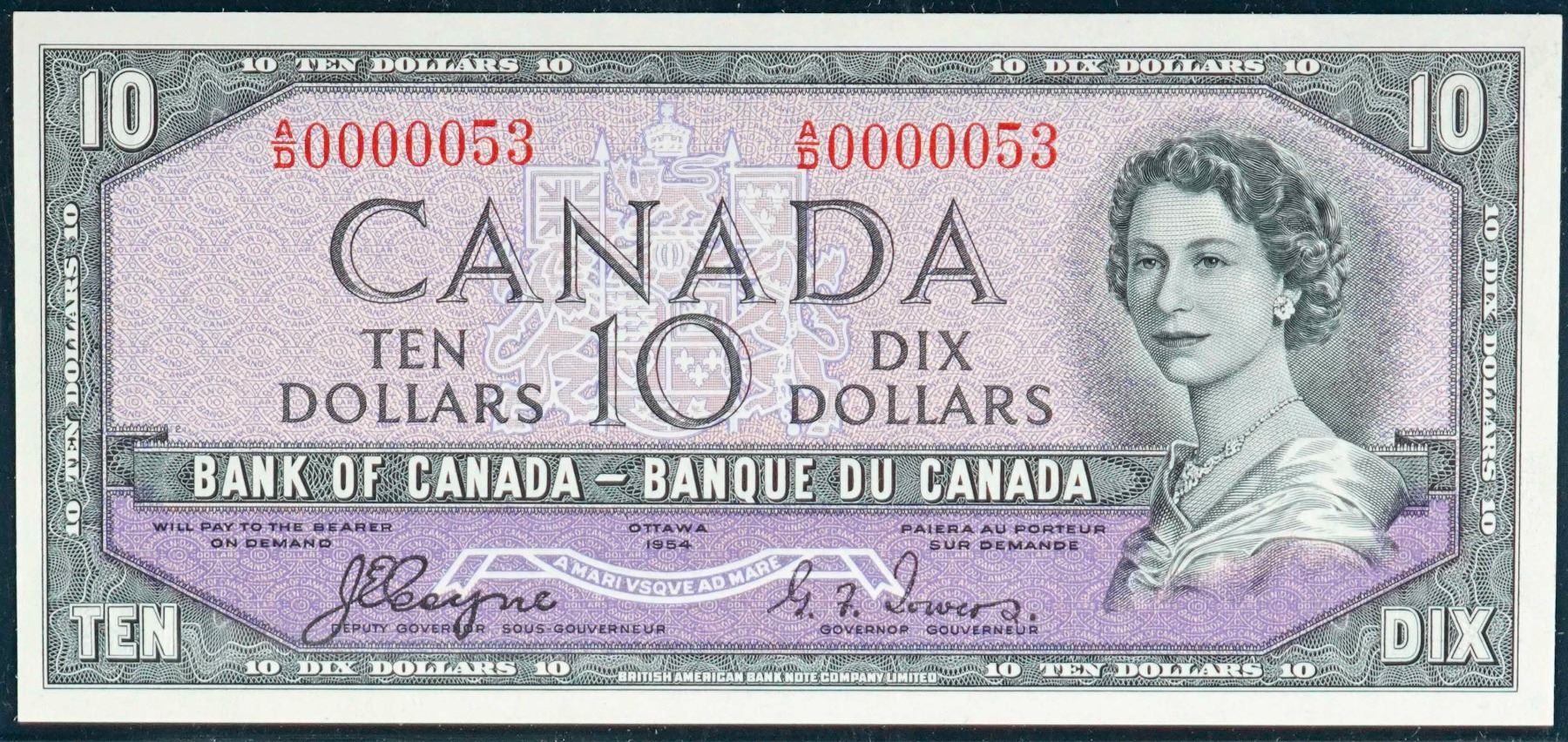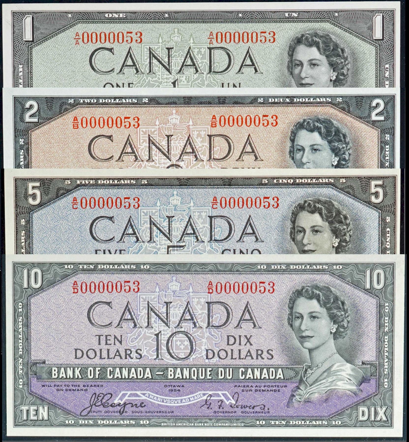 Matching set; 1954 $1-$10 Devil's Face - Coyne Towers. All w/Serial #0000053. LCG Choice Uncirculated-63PPQ to Gem Uncirculated-65PPQ