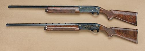 Matching set of Remington model 1100 semi-automatic shotguns ,12ga and 20ga, fully and finely custom engraved and gold inlaid with select checkered burl walnut stocks, serial #L837086V and L274419X, the 12ga serial number L83 shows 26” skeet choked barrel, ventilated rib, and is very finely engraved with scroll engraving, two gold game birds on left, two on right, finely refinished and nicely custom stocked. Engine turned bolt and follower. Excellent condition as restored. 99% to new. Along with its 20ga mate which shows 26” barrel, ventilated rib, matching engraving, stocking, etc. Also excellent as restored at time of engraving. A very attractive set, they are very high quality and similar to several sets known to have been handled by Kerr’s of Beverly Hills. From the Robert Petersen Estate. Est: $2,000 - $4,000