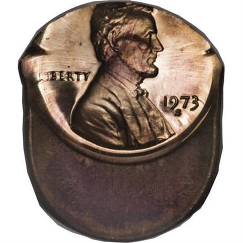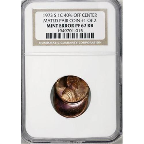 <B>Mated 1973-S Lincoln Memorial Cent Pair PR67 Red and Brown NGC.</B></I> One of the two NGC coins is graded MS67 Red and Brown, an oversight since both pieces were struck as proofs. Two planchets were fed between the dies at a time when the collar die was blocked. The two planchets partly overlapped during the strike. The first cent, coin #1, is 40% off center toward 12:30 and has an 75% indent on the reverse from coin #2. The indent of coin #1 is centered at 7 o'clock relative to the reverse. Coin #2 is 45% off center toward 12:30, relative to the reverse. The obverse of coin #2 has a 90% obverse indent from coin #1. The struck surfaces are mostly orange-gold with blushes of plum-mauve toning. Significant proof errors are rare, since they are subject to close mint supervision. Mated pair proof errors are even more difficult to acquire.<BR><BR><B>Coin Engraver:</B> Victor D. Brenner<BR><BR><b>Shipping:</b> Coins & Currency (<a target="_blank" href="http://www.heritageauctions.com/common/shipping.php">view shipping information</a>)