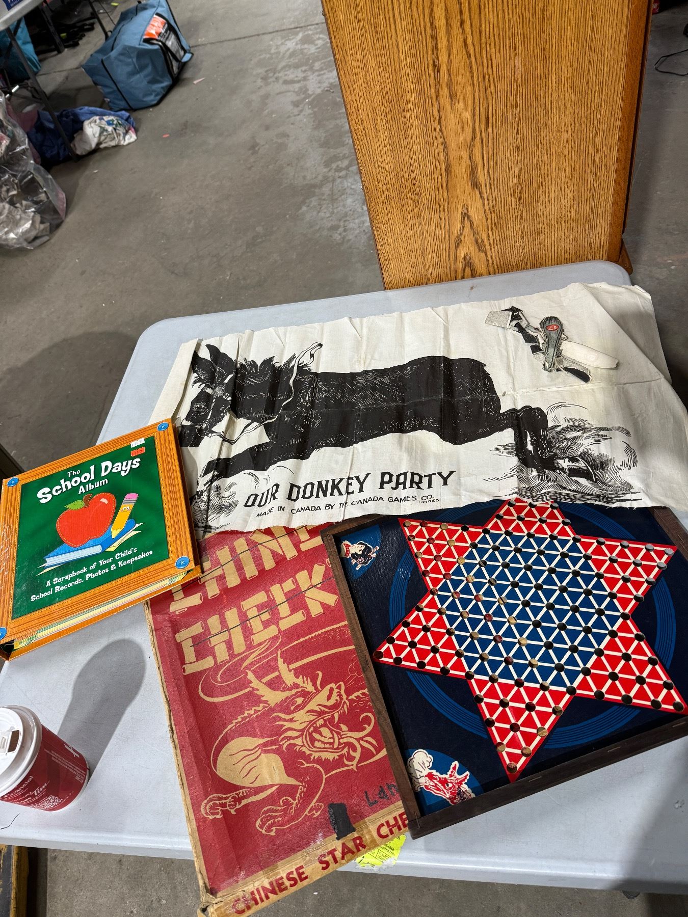 Material pin the tail on the donkey and schooldays album and Chinese checkers board