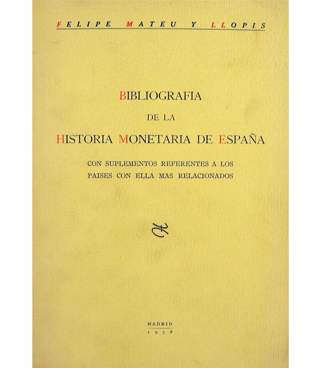 Mateu y Llopis, Felipe. BIBLIOGRAFÍA DE LA HISTORIA MONETARIA DE ESPAÑA CON SUPLEMENTOS REFERENTES A LOS PAÍSES CON ELLA MÁS RELACIONADOS. Madrid: Fabrica Nacional de Monedas y Timbre, 1958. 8vo, original printed card covers. xv, (1), 410, (2) pages. Fine. A scarce and very important bibliography. Clain-Stefanelli 11315: "A comprehensive but not critical bibliography, includes Portugal and Latin America."