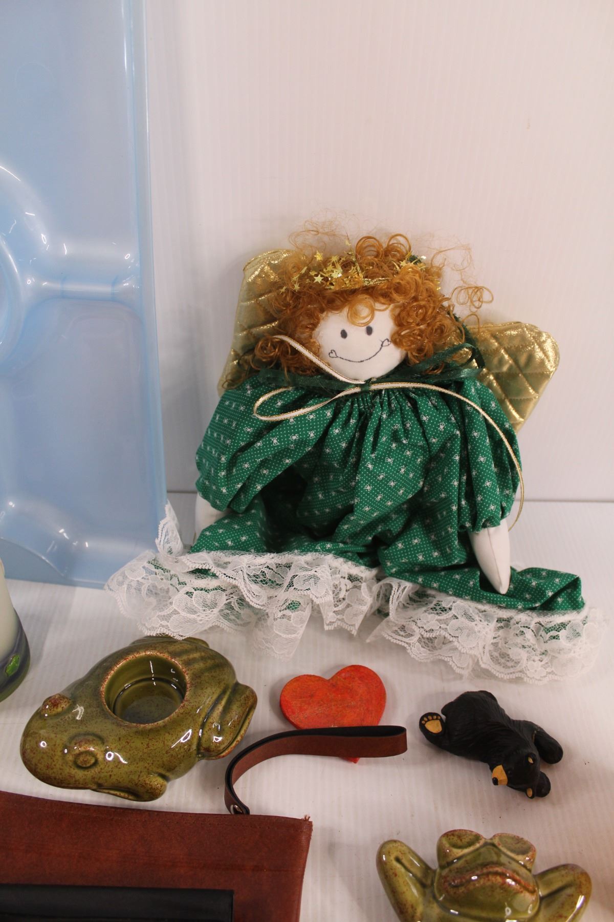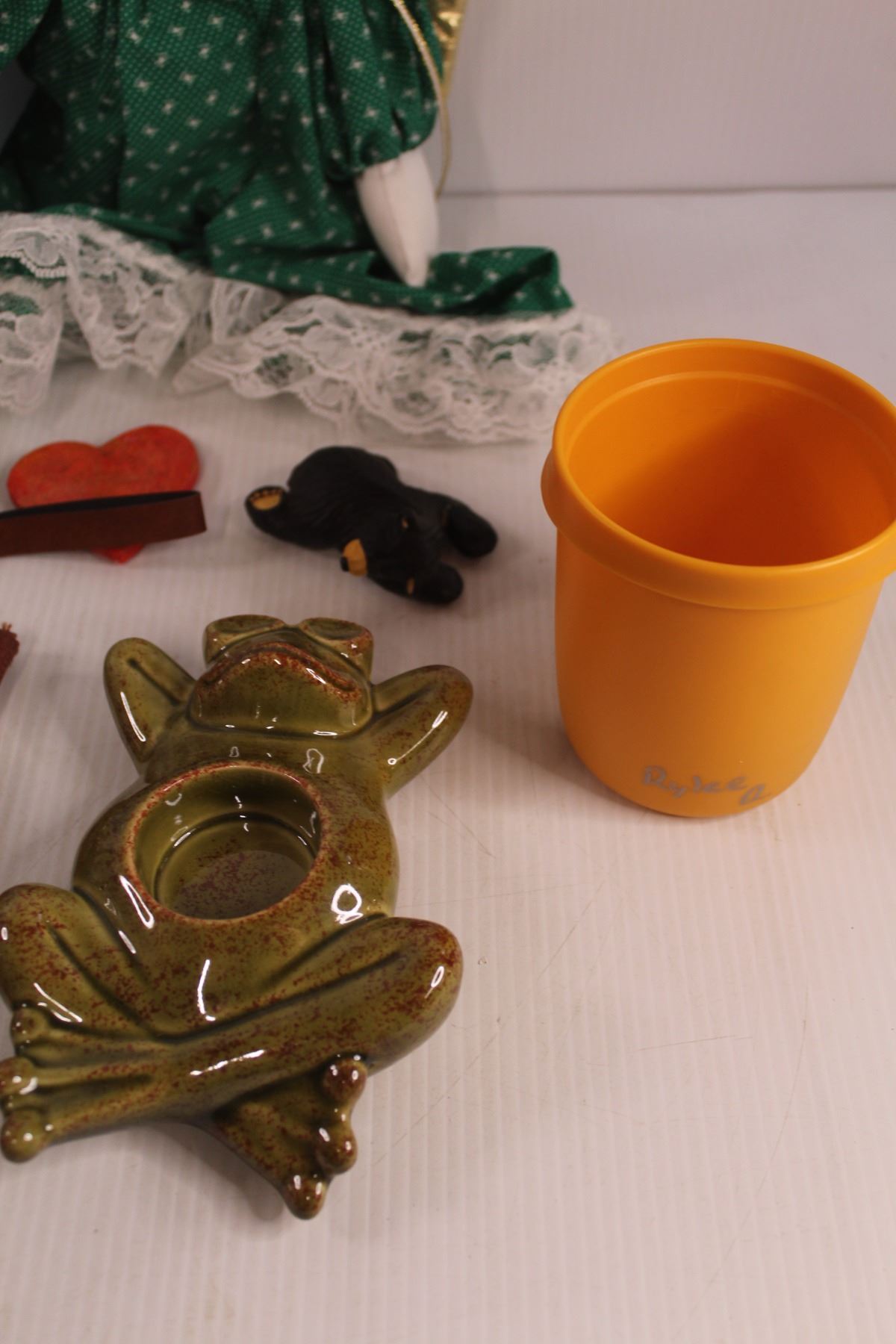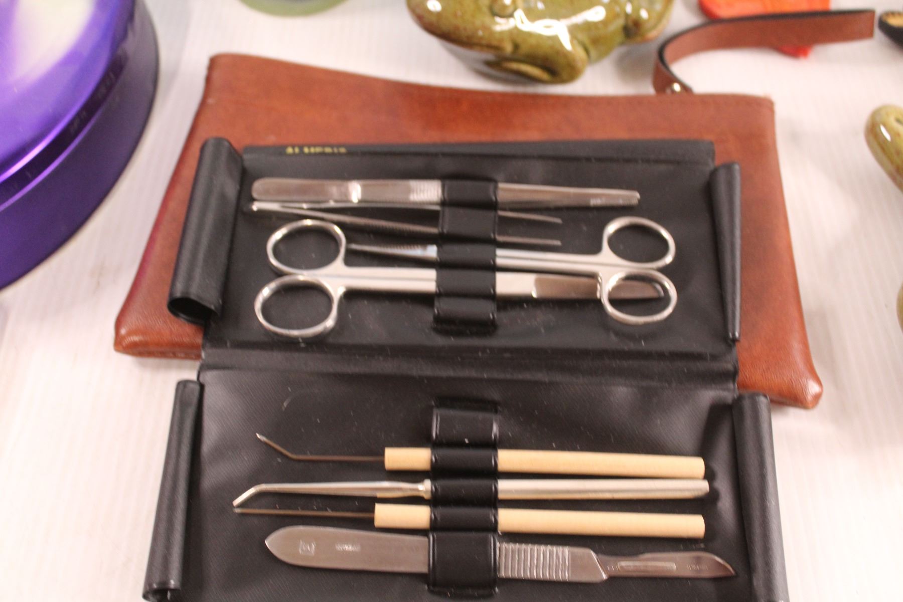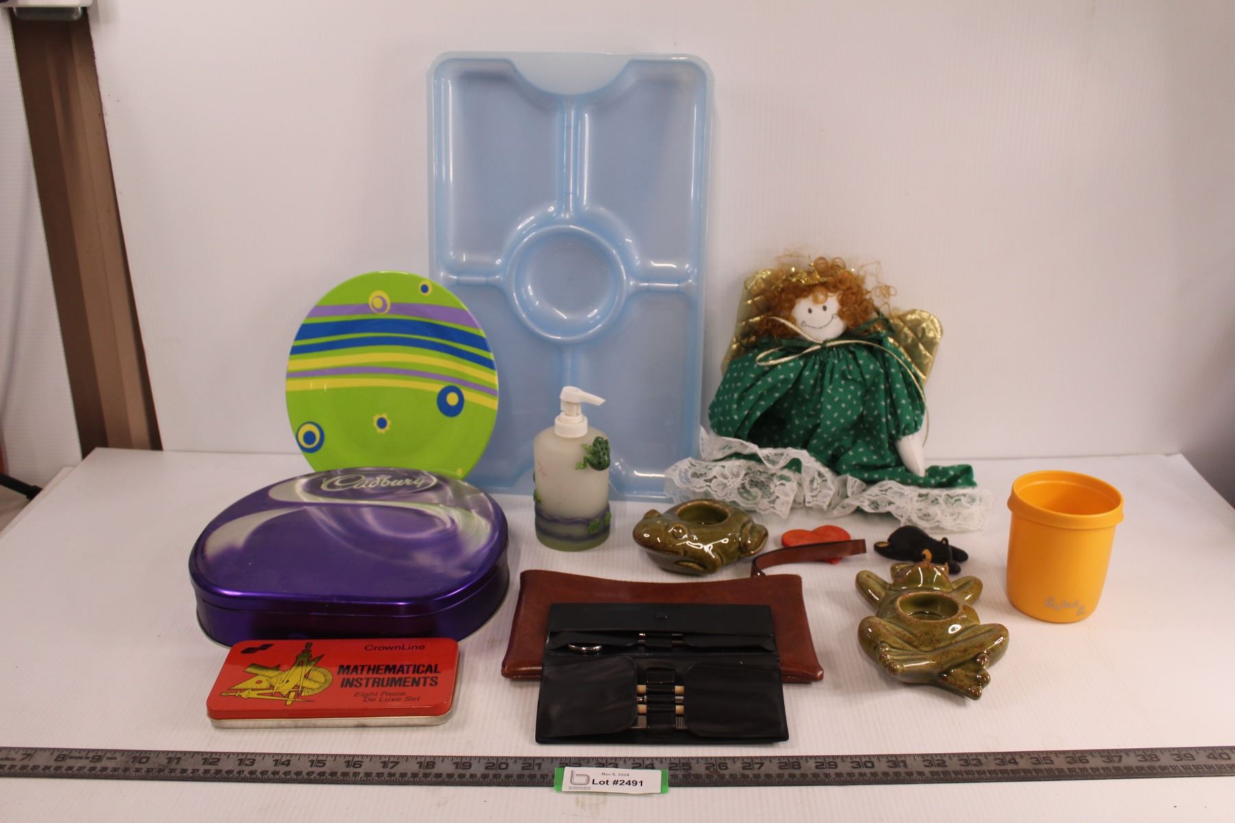 Math Instruments Set, Cadbury Tin, Plastic Plate & Serving Tray, Frog Soap Dispenser, (2) Glass Frog Candle Holders, Medical Instruments w/ Black Leather Case, Leather Pencil Case, Doll, Misc.