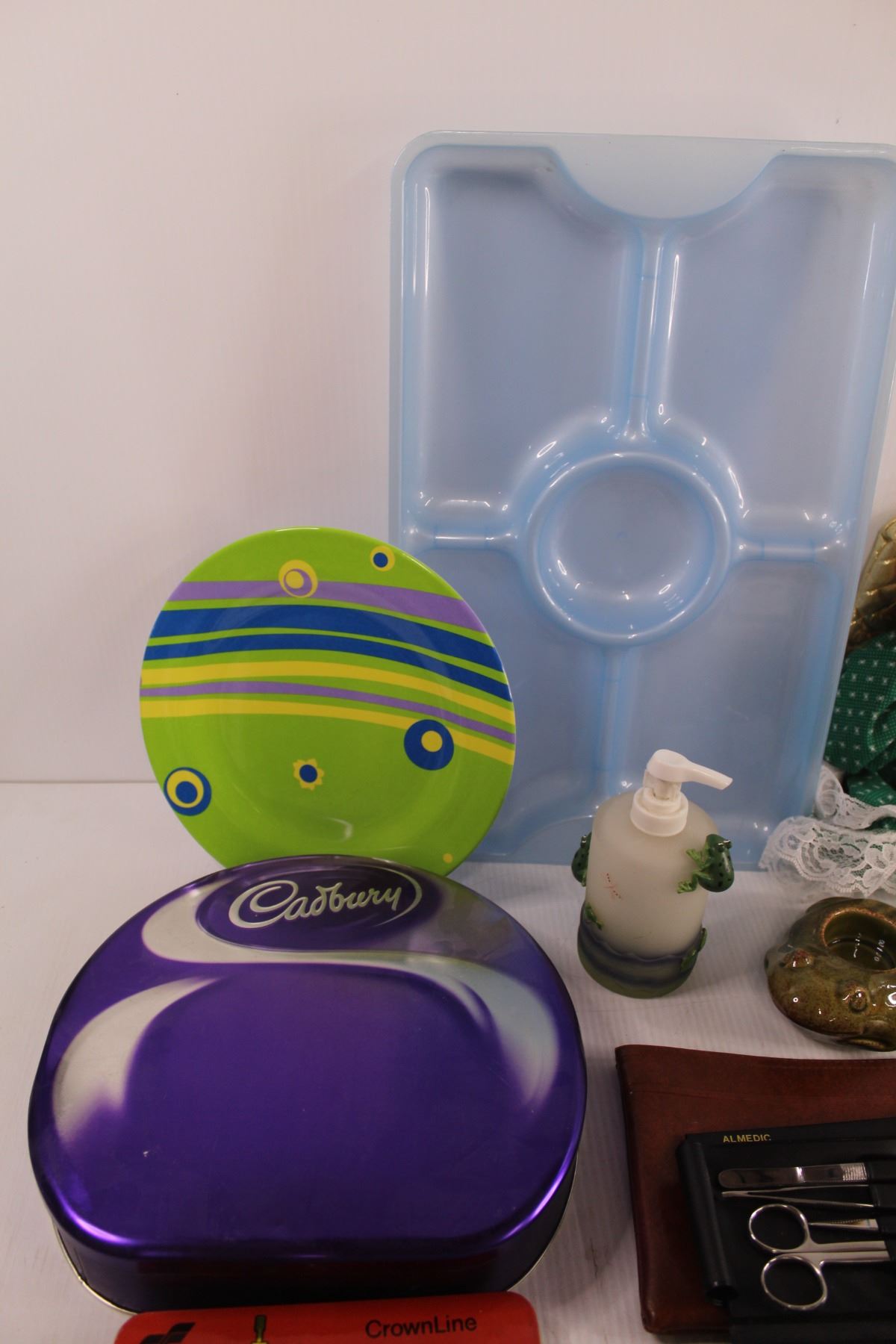 Math Instruments Set, Cadbury Tin, Plastic Plate & Serving Tray, Frog Soap Dispenser, (2) Glass Frog
