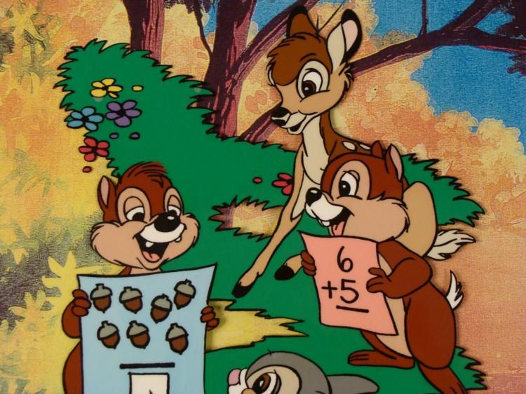 Bambi and his friends are learning doing math problems * * * Printed Background and Animated CelMedium: Hand painted acetate celDetails: Numbers and peg holes * * Size of Cel: 10 1/2 x 12 1/2 inchesSize of Background: 11 x 17 inches * * Condition: Very Good * This is an original hand-painted cel set-up used in the production of "Bambi." Each one-of-a-kind set-up represents a slight change in position of the characters. When individually photographed and projected in rapid succession, the images appear to move. * * To create production cels, the original animator's drawing is transferred onto an acetate cel (by hand-inking and/or photo copying). The cel is then hand-painted on the reverse side. The background accompanying this set-up is a printed reproduction background * * *