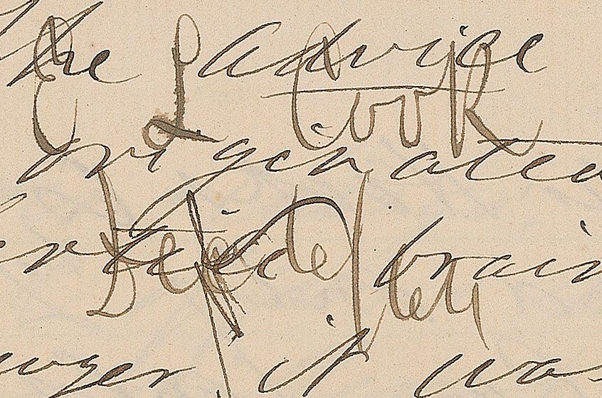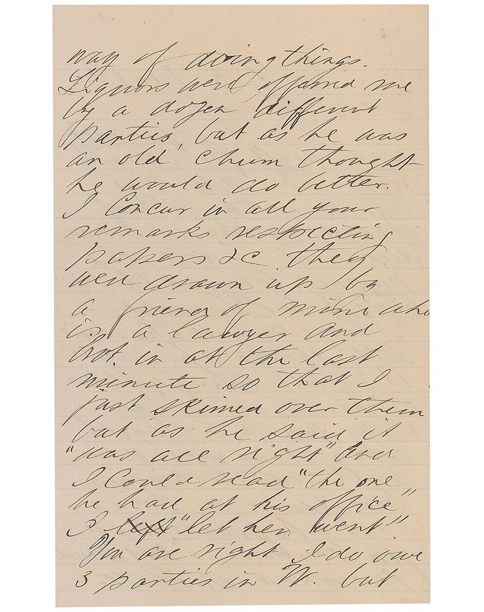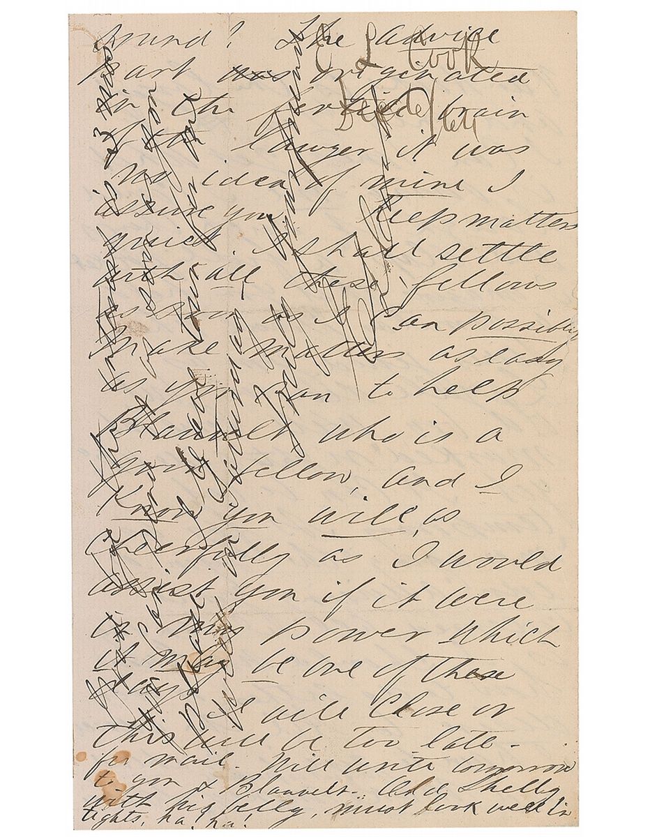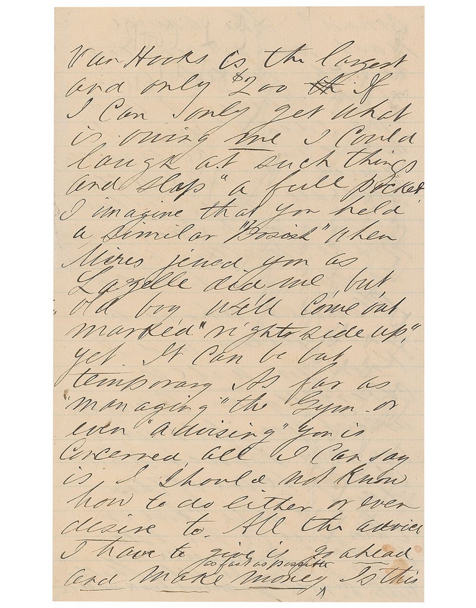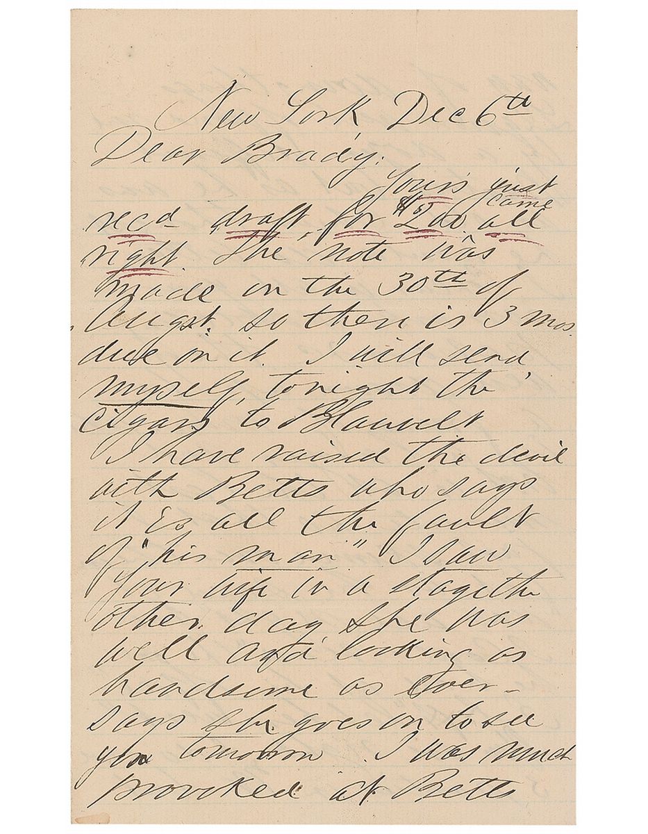 Docketing notation in Brady’s hand, “E. L. Cook, Dec. 6/64,” on the last page of a four-page ALS to Brady from Cook, four pages on two adjoining sheets, 5 x 8, December 6 [1864]. Letter to Brady reads, in part: “Yours just recd draft for $200 came all right. The note was made on the 30th of Augst so there is 3 mos. due on it. I will send myself tonight the cigars to Blauvelt. I have raised the devil with Betts who says it is all the fault of ‘his man.’ I saw your wife in a stage the other day She was well and looking as handsome as ever—says she goes on to see you tomorrow. I was much provoked at Betts way of doing things. Liquors were offered me by a dozen different parties, but as he was an old chum thought he would do better. I concur in all your remarks respecting papers &c they were drawn up by a friend of mine who is a lawyer and brot in at the last minute so that I just skimmed over them but as he said it ‘was all right’…You are right I do owe 3 parties in W. [Washington] but Van Hooks is the largest and only $200. If I can only get what is owing me I could laugh at such things and slap ‘a full pocket…As far as managing ‘the Gym’ or even ‘advising’ you is concerned, all I can say is I should not know how to do either or even desire to. All the advice I have to give is go ahead and make money as fast as possible. Is this sound? The advice part was originated in the fertile brain of the lawyer it was no idea of mine I assure you.” In fine condition, with intersecting folds, a few light stains, and moderate contrast to docketing, which is written over a portion of the text.