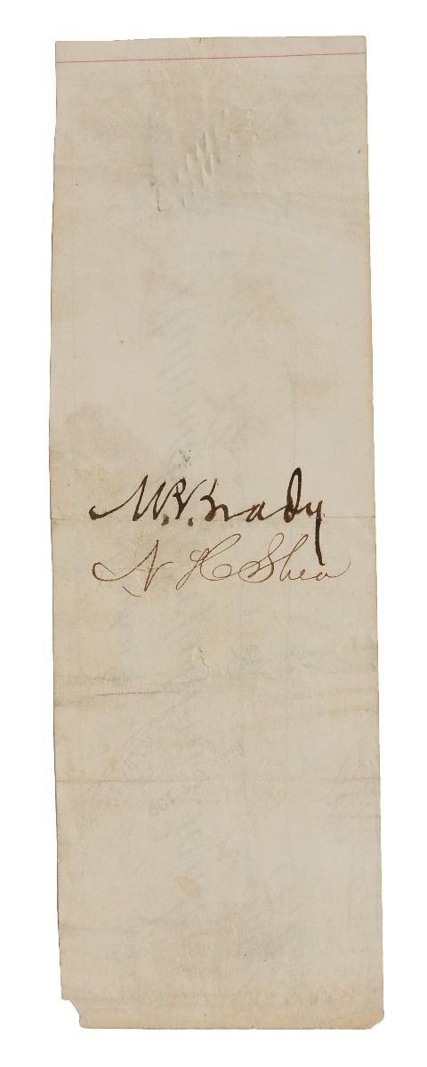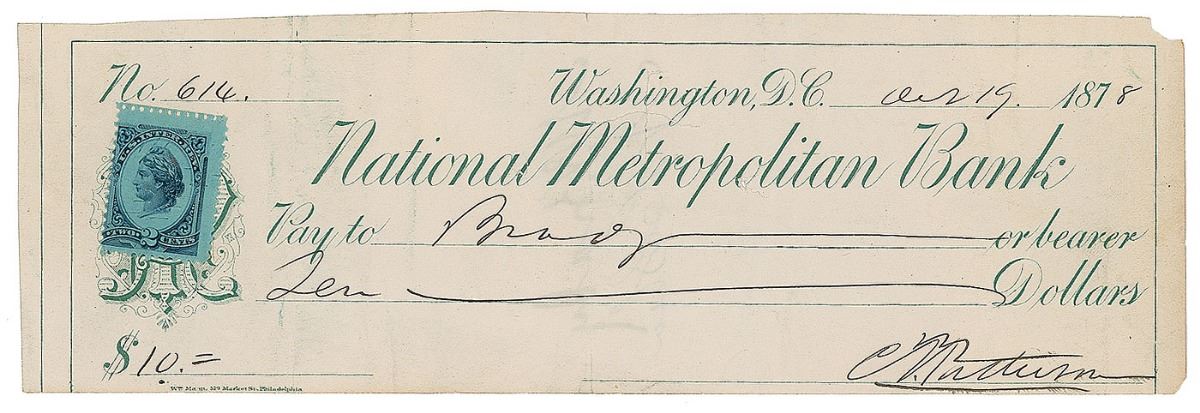 Scarce National Metropolitan Bank check, 8.25 x 2.75, filled out in another hand, payable to Brady for $10, October 19, 1878, endorsed on the reverse in black ink,”M. B. Brady.” In fine condition.