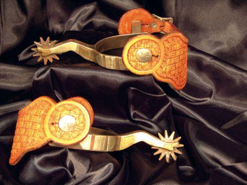 Mathey Custom Made Gal Leg Spurs, double mounted, nickel and brass. Basket weave pattern leathers. Very good condition.