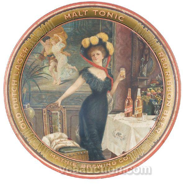 Mathie Brewing Co. Los Angeles, CAL. Tin Serving Tray, "Old Dutch Lager, Malt Tonic, Red Ribbon Beer" - 13" diam.