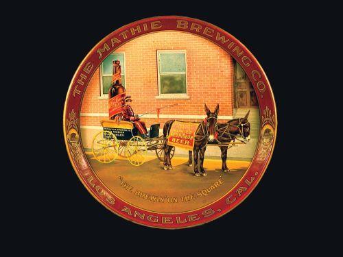 Mathie Red Ribbon Beer Tin Servng Tray, The Mathie Brewing Co., Los Angeles, Calfiornia, excellent condition, 12 inch diameter.