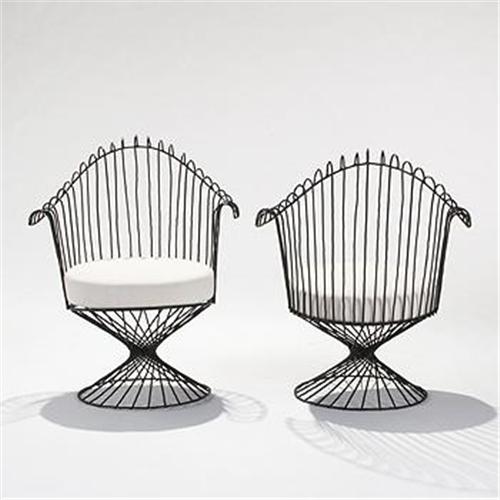 Mathieu Mategot, attribution chairs, pair France, c. 1950 enameled metal, upholstery 26.5 w x 32 d x 34 h inches