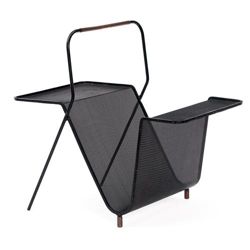 Mathieu Mategot magazine rack, perforated black enameled metal, brass feet, 13.25"w x 20.25"d x 19"h, was repainted probably years ago (not recently), excellent condition