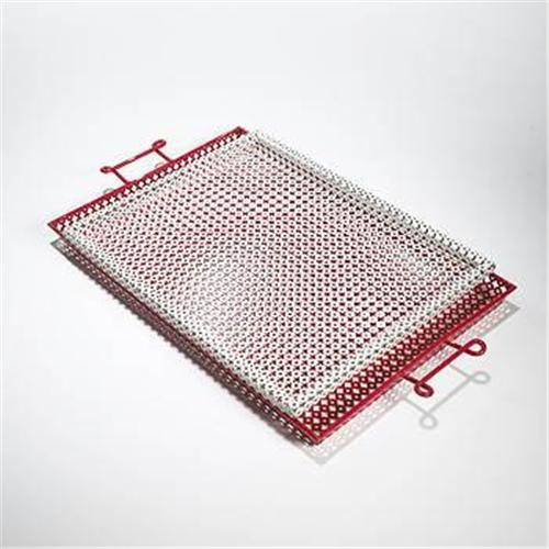 Mathieu Mategot serving trays, pair Ateliers Mategot France, c. 1950 perforated and enameled metal 24"w x 14"d x 2"h Smaller tray measures: 17.5"w x 14"d x 2"h