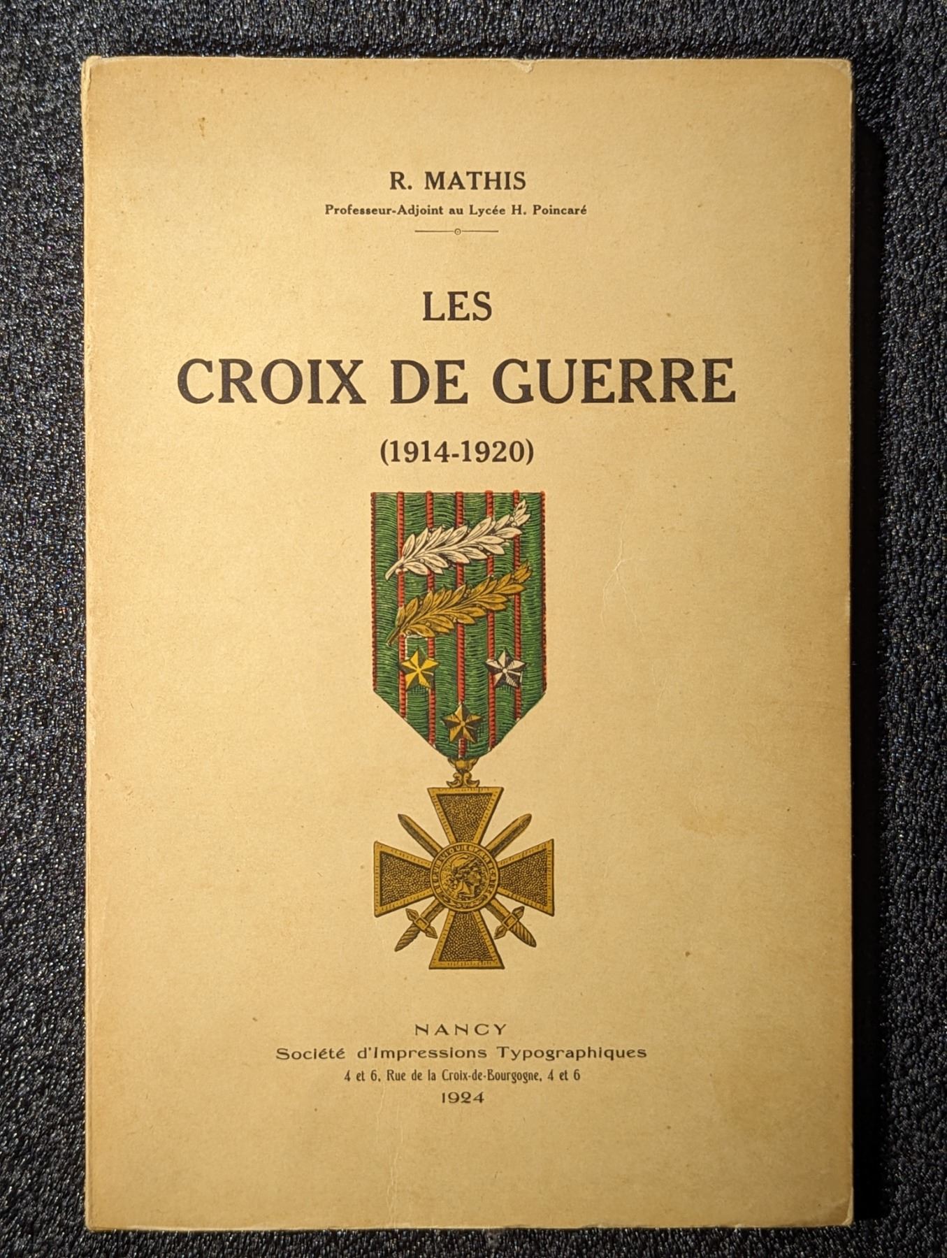 Mathis, R. LES CROIX DE GUERRE 1914-1920. Societe d'Impressions Typographiques, Nancy. 1924. 8vo. 135, (1) pages. Original printed card covers. 11 b&w plates. Errata laid in. Fine. Lot weight: 0 lbs 15oz. Subject(s): French Orders and Decorations.