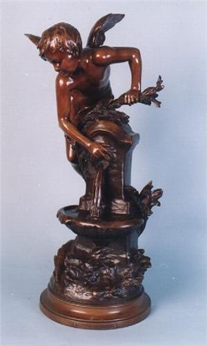 Mathurin Moreau (1822-1912) French Romantic school. "L'Amour a la Fontaine". An important bronze figure of a cupid at a fountain. Signed, numbered and with "Societe des Bronzes" stamp on naturalistic base. Very fine patina. 28" high. Reference: Benezit, volume 6, page 213.