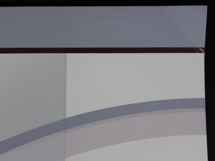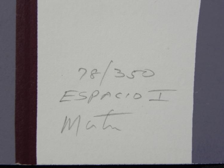 This modern print has a nice arch in purple and lilac tones. * Artist: Mati (?)Signature: In pencil, lower leftTitle: Espacio I * Medium: Print on paperEdition: 78/350Sheet size: 26 x 26 inchesCondition: Very good; corner crease, upper right, and a couple image scuffs