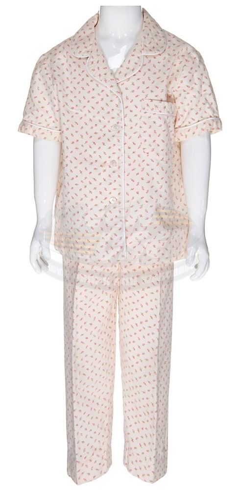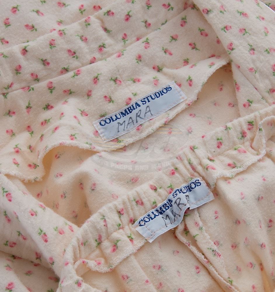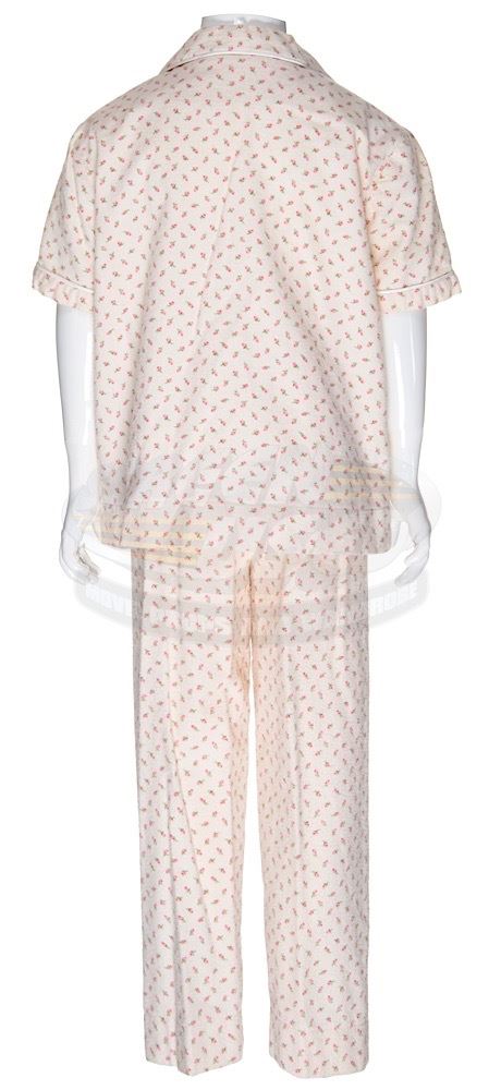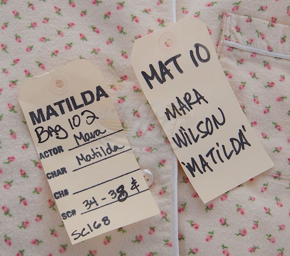 (TriStar Pictures, 1996) This set of pajamas were acquired by the production for use by Mara Wilson as "Matilda". The two piece matching pajamas feature a flower pattern and both pieces have a Columbia Studios tag attached inside with "Mara" written in ink. Included with the pajamas is a production used costume tag that details the scene numbers used.