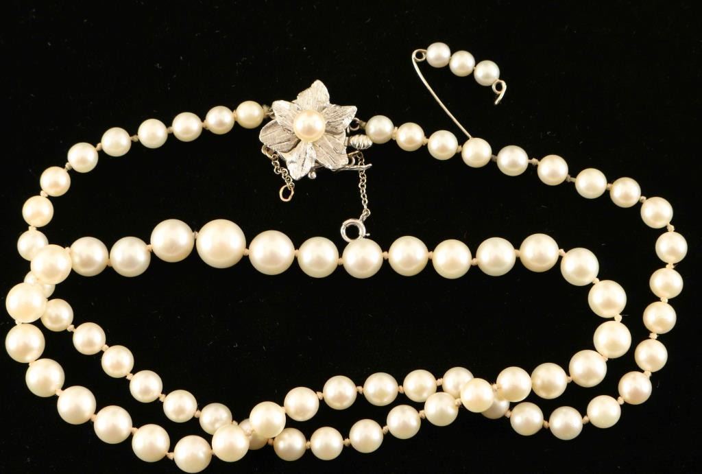 Single strand cultured pearls with fabulous luster. Measure 5-9mm with a floral motif 14K white gold clasp with a pearl center. Comes with appraisal from purchase date in May of 1982.