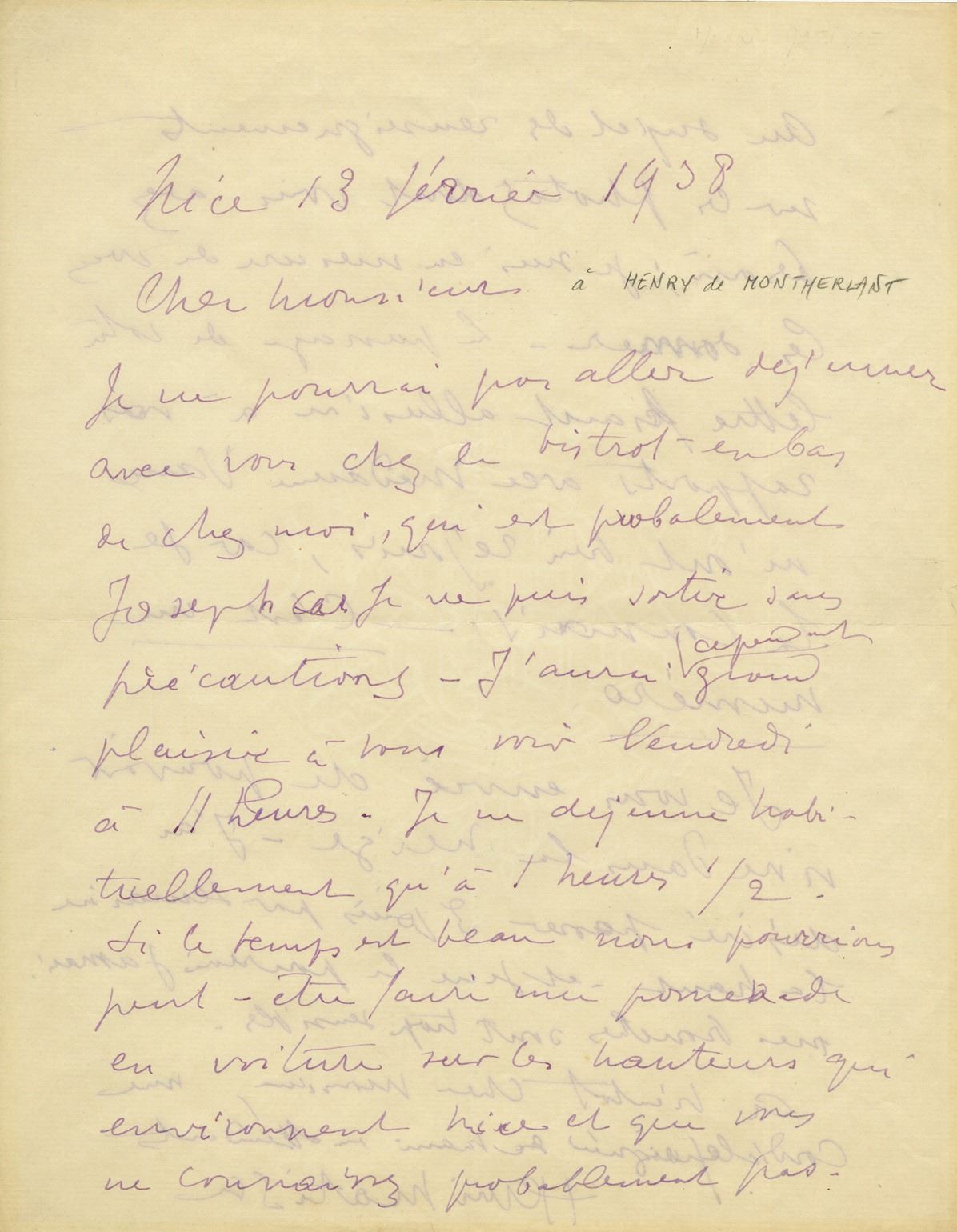 148. * Matisse, Henri. Autograph letter signed ("Henri Matisse"), 1-page (8.25 x 10.5 in.; 210 x 267 mm), front and back, in French, "Nice", 13 February 1938, written to "Dear Sir" [notated in another hand in pencil, "a Henry de Montherlant" - French essayist, novelist and dramatist]. Usual folds.