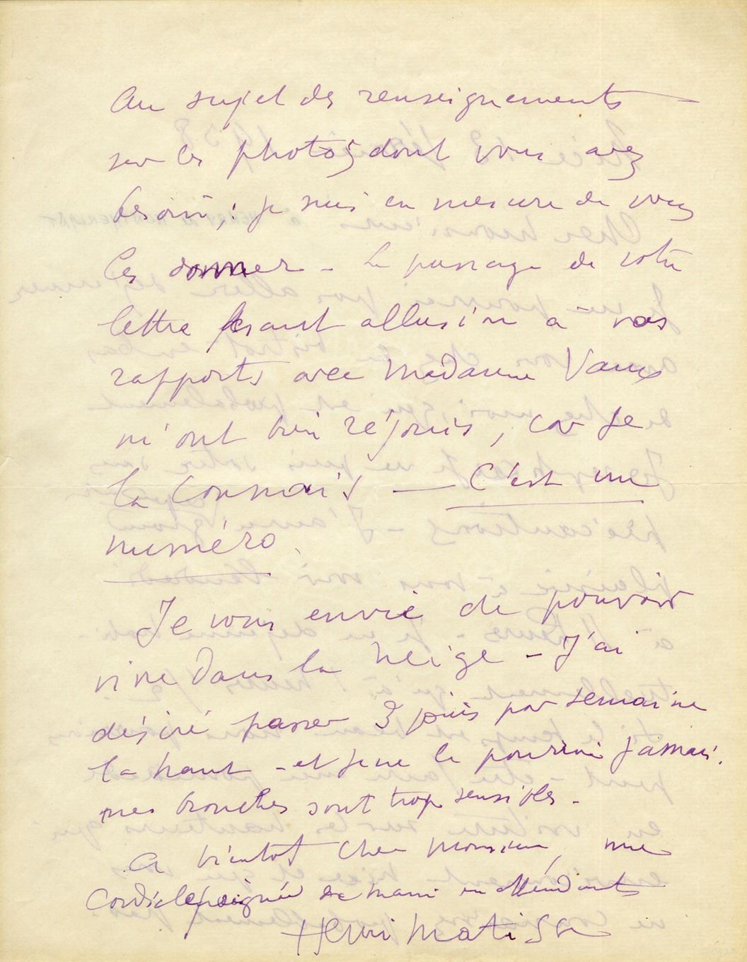 I will not be able to lunch with you at the bistro below me which is probably Joseph, for I cannot go out without taking care. It would, however be a great pleasure to see you on Friday at 11 o'clock. I don't normally lunch before 1.30pm. If the weather is fine, we might perhaps take a little spin in the car on the hills around Nice with which you are probably not familiar. As to the information you require about the photos; I will be able to give you this. The passage in your letter concerning your dealings with Madame Vaux cheered me up very much, for I know her - she is a character.