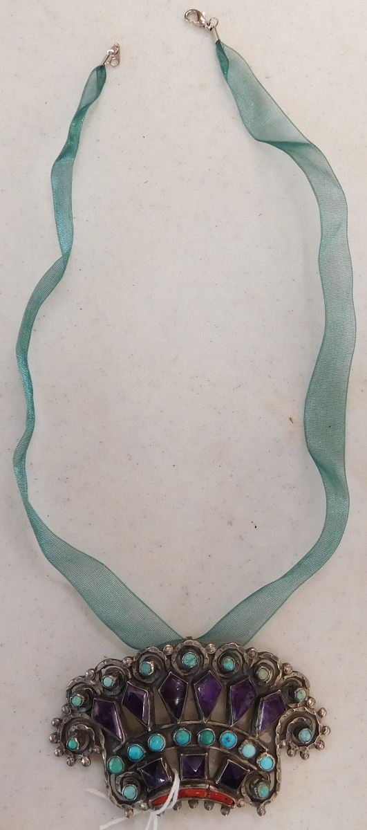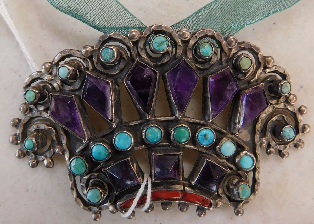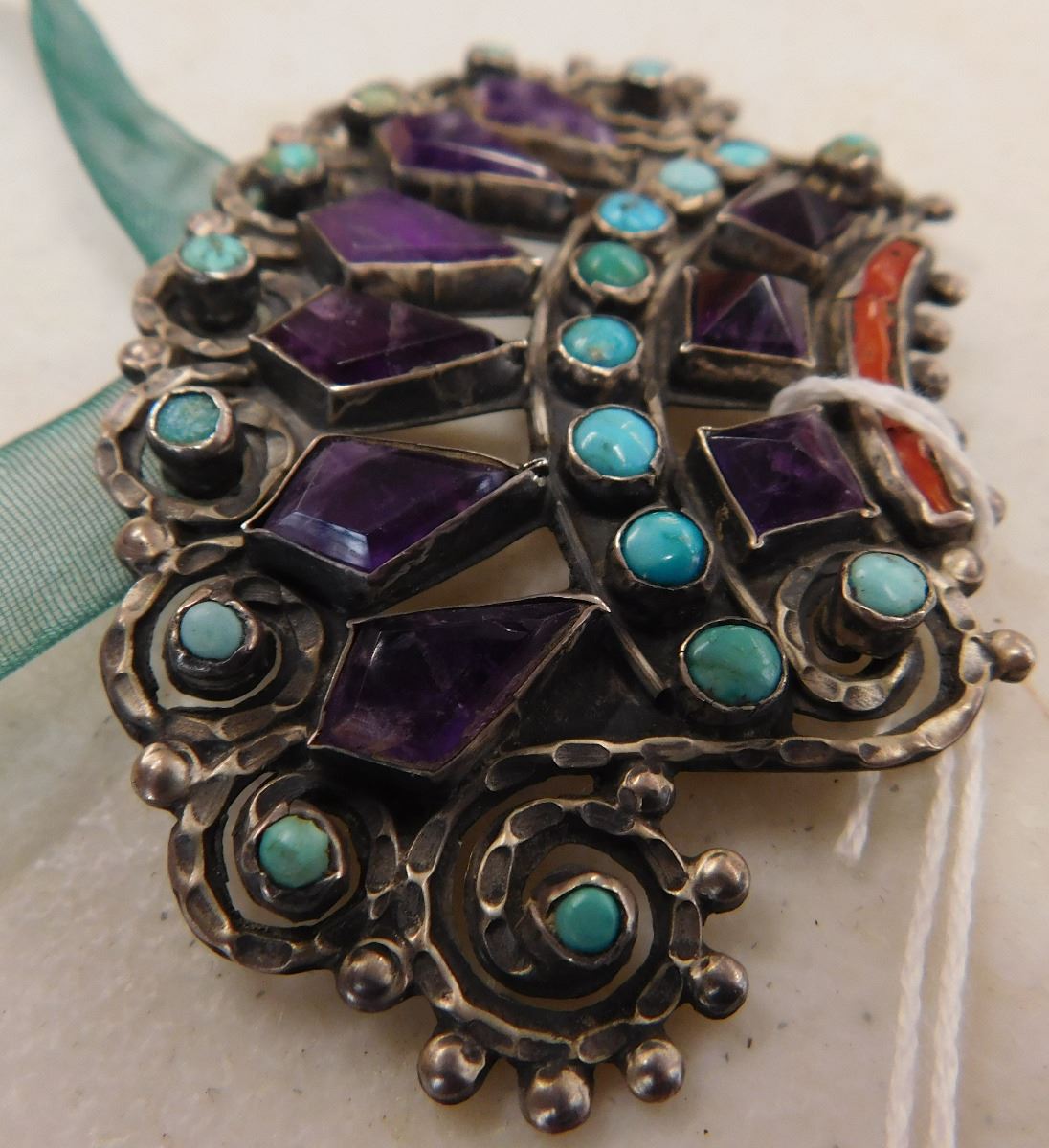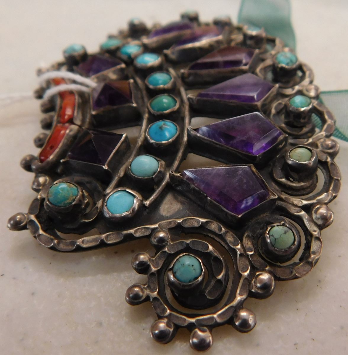 Matl Poulat Sterling Silver & Stone Brooch, circa 1930s. Made of sterling silver, amethyst quartz, turquoise and coral, the brooch is 3" x 2", and weighs approx. 25.9 grams. Item is currently configured as a necklace due to missing fastener bar, easily fixed. Mexico, Taxco, .925. Regis. #142093. Matilde Eugenia Poulat studied with the famous Mexican painter Diego Rivera. Her work is held in high esteem; William Spratling was impressed. Condition: Great patina, missing brooch fastenter, see images. Shipping: $22.50 w/insurance and signature,