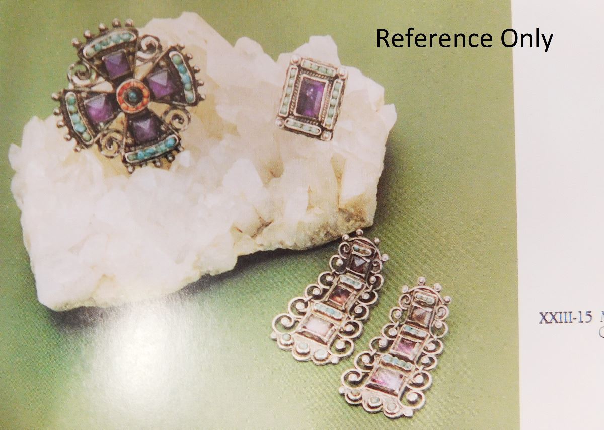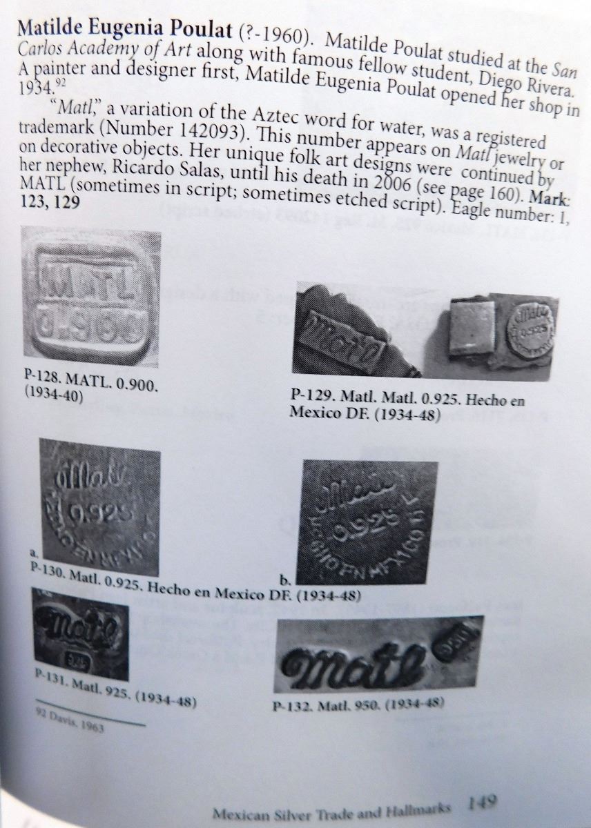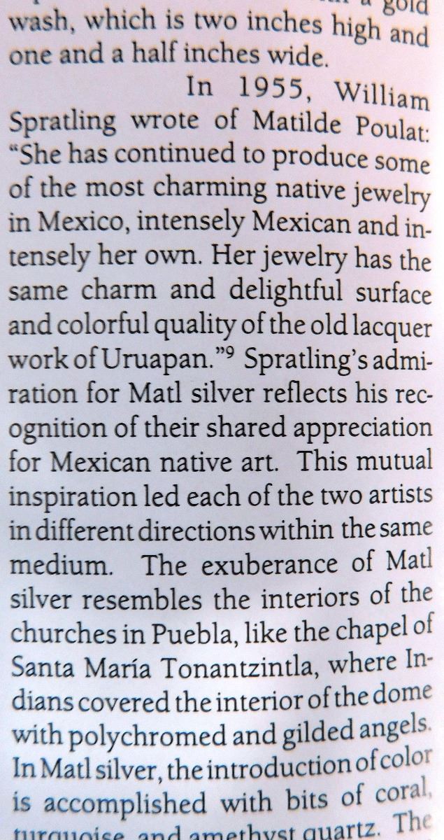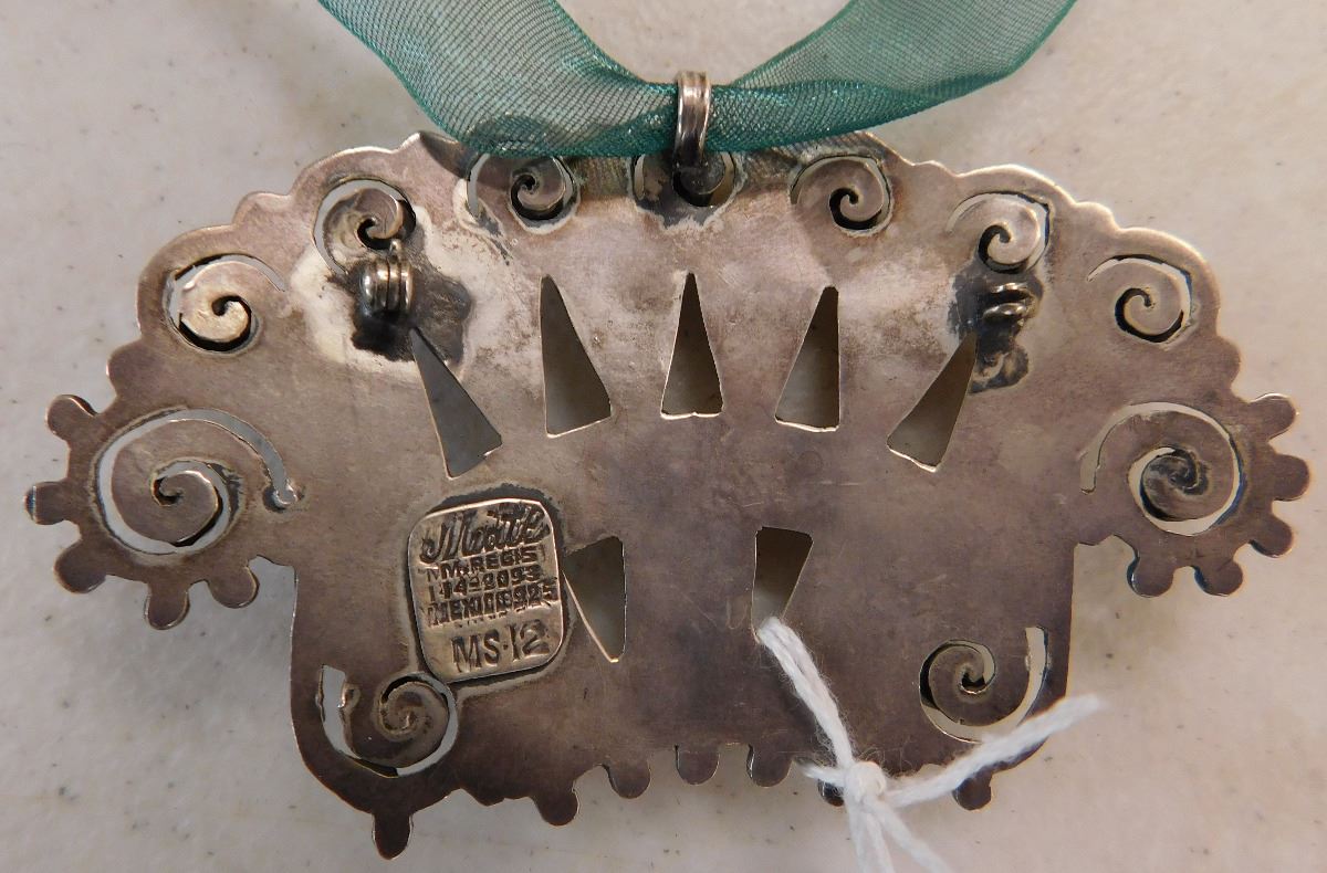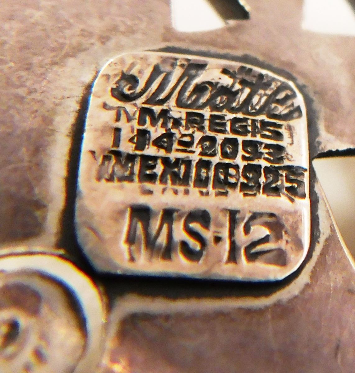 Matl Poulat Sterling Silver & Stone Brooch, circa 1930s. Made of sterling silver, amethyst quartz, turquoise and coral, the brooch is 3" x 2", and weighs approx. 25.9 grams. Item is currently configured as a necklace due to missing fastener bar, easily fixed. Mexico, Taxco, .925. Regis. #142093. Matilde Eugenia Poulat studied with the famous Mexican painter Diego Rivera. Her work is held in high esteem; William Spratling was impressed. Condition: Great patina, missing brooch fastenter, see images. Shipping: $22.50 w/insurance and signature,