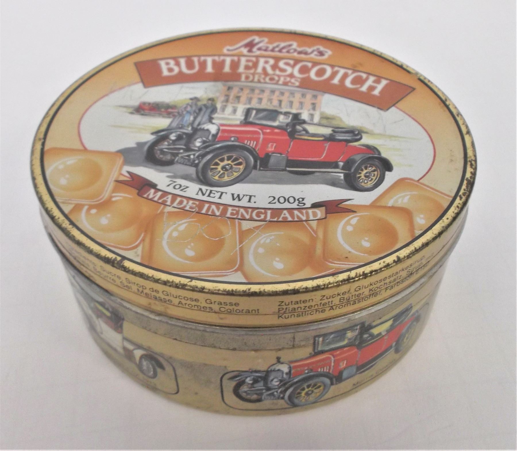 Matlow's Butterscotch Drops Tin with Antique Cars