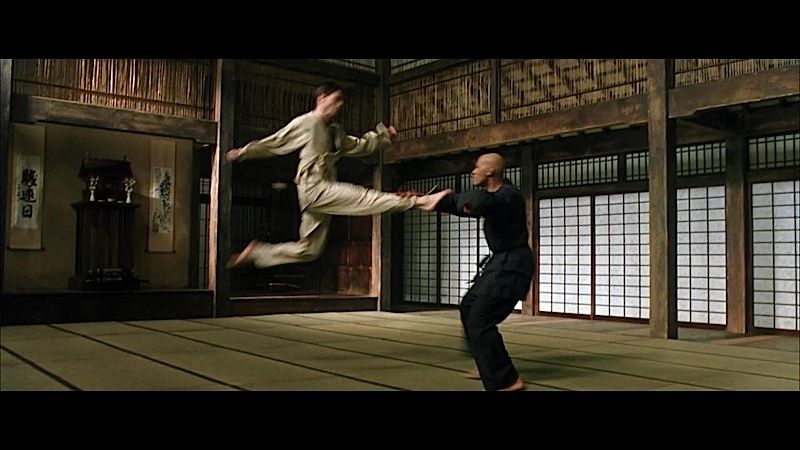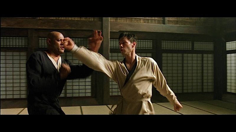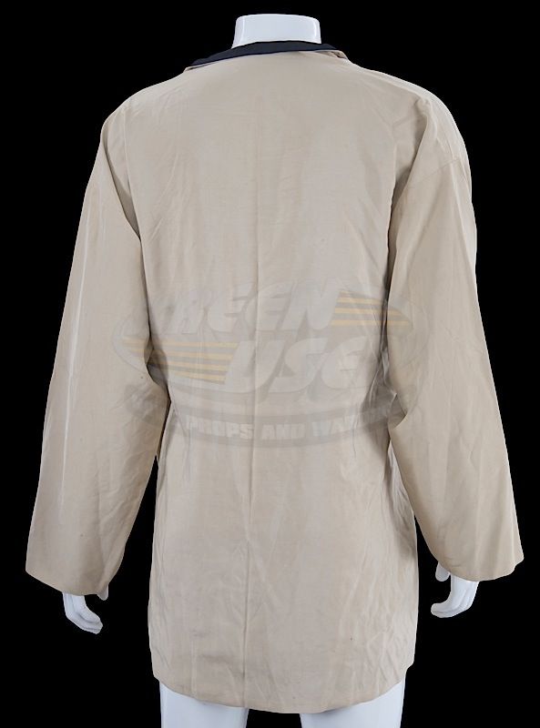 (Warner Bros. Pictures, 1999) This Karate gi was made by the production for use by the character Neo, and worn on screen by stuntman Paul Doyle in the famous training dojo scene. There were two main types of gis used during filming; silk for screen use and linen for practice. This tan and black silk gi is in great screen used condition and has a tag on the inside with "Paul" written on it. This is the top only, no pants.