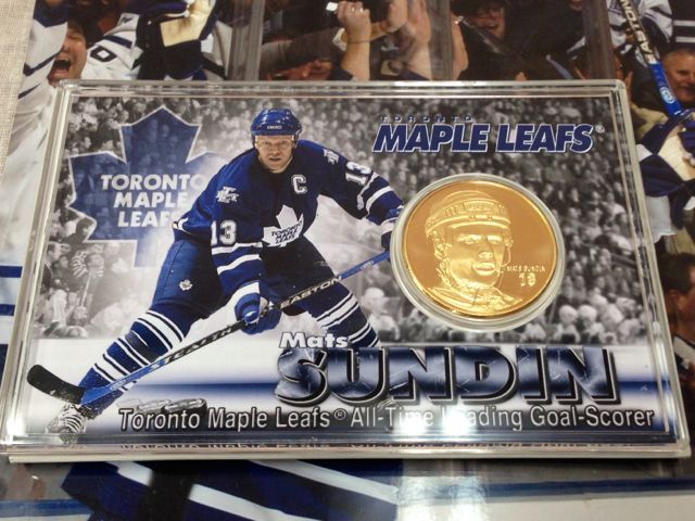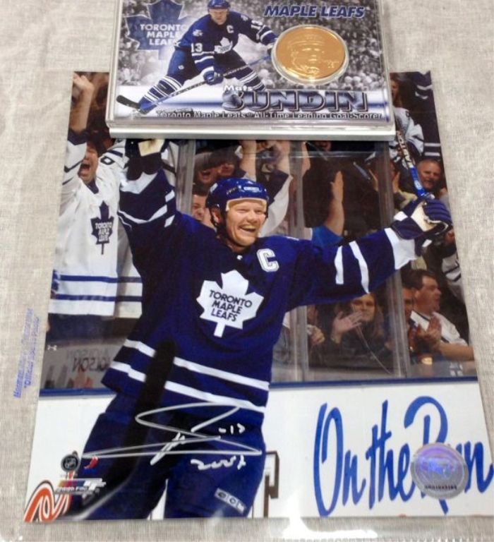 Mats Sundin 8 x 10 Photo signed w/ 24kt gold over sterling silver collector coin in original capsule. The coin has never been sold at a retail level, it was an exclusive for friends and family during Mats final year