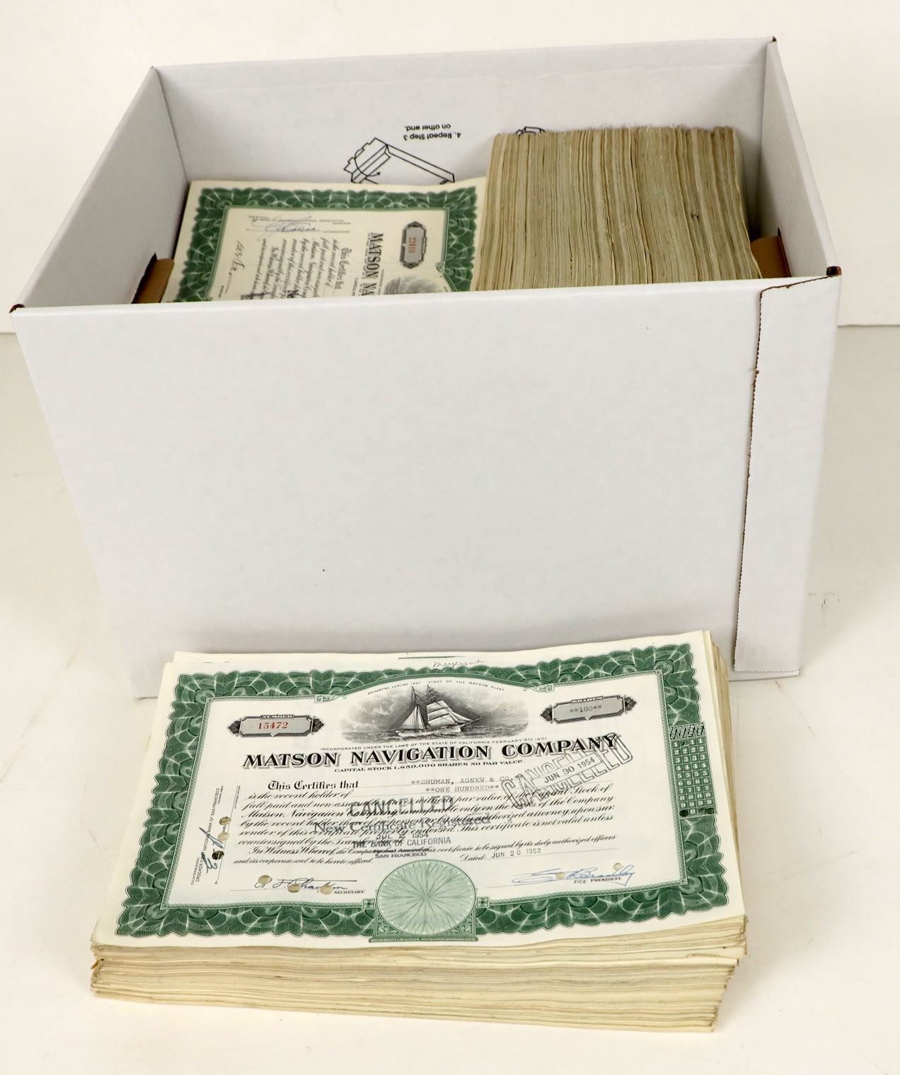 Bankers box of about 2000 stock certificates from Matson Navigation Company, circa 1950s. Green ink, sailing ship vignette.