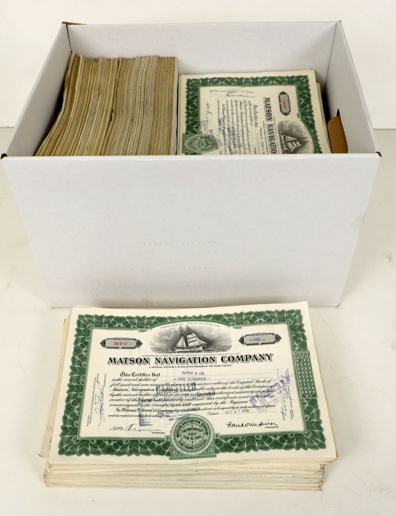 Bankers box of about 2000 stock certificates from Matson Navigation Company, circa 1950s. Green ink, sailing ship vignette.