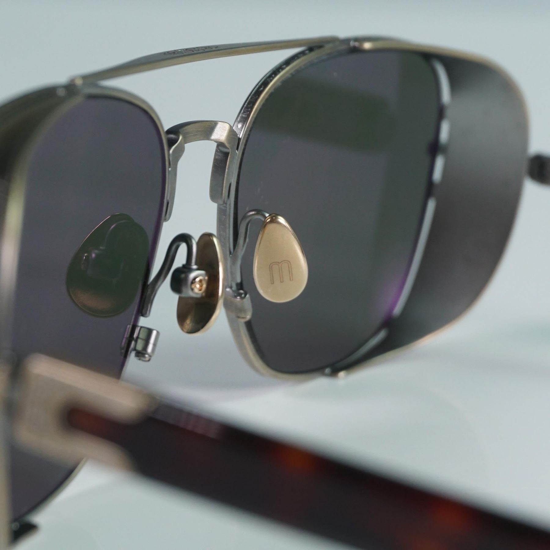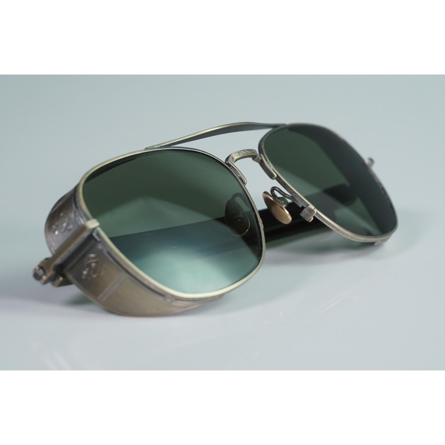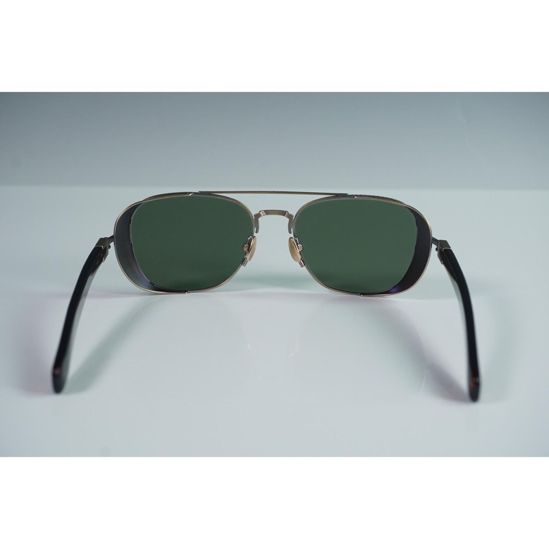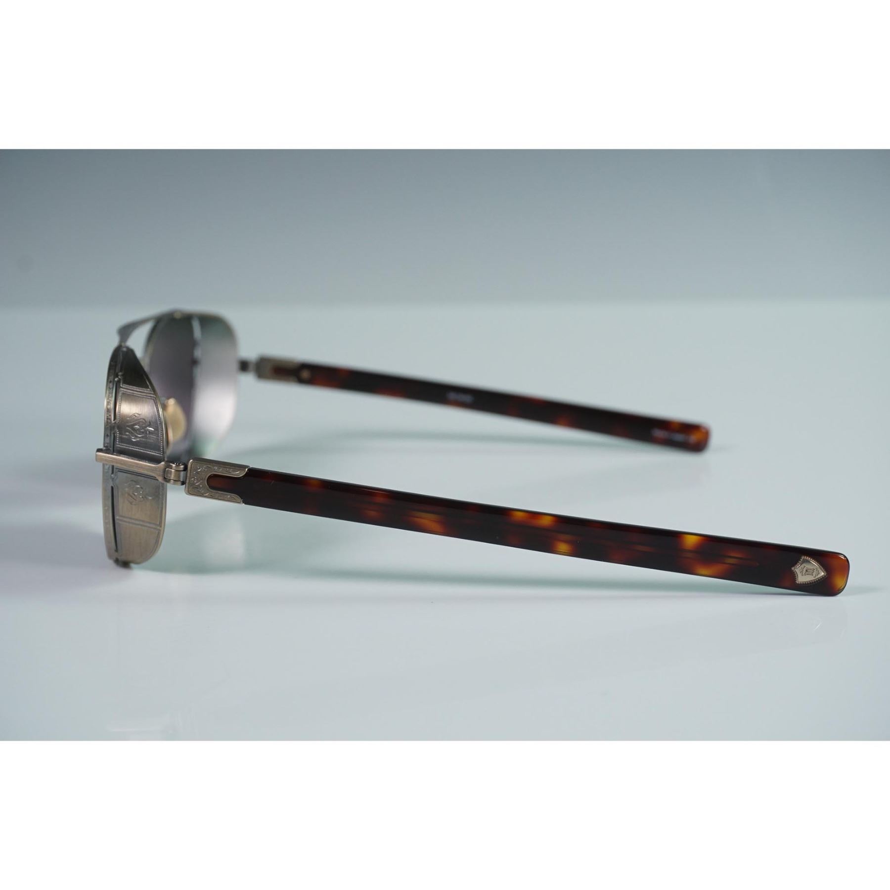 A striking pair of Matsuda M3115 aviator sunglasses, handcrafted in Japan, showcasing the brand's hallmark craftsmanship and intricate detailing. These sunglasses feature an antique silver tone titanium frame with engraved side shields, complemented by tortoiseshell acetate temples. The dark green custom double nylon lenses offer a high-end blend of durability and style, while the adjustable titanium nose pads are engraved with Matsuda's iconic M logo. Markings on the inner arms include, M3115, Matsuda, 55 18-135, and Made in Japan.
