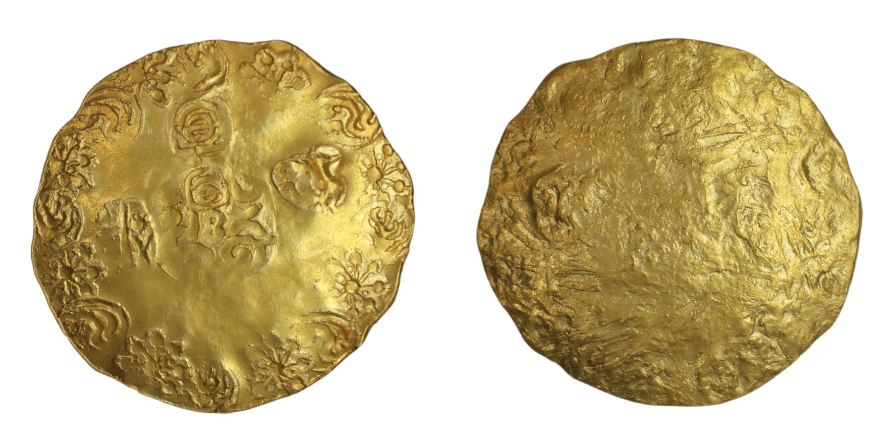 Matsya Kings of Oddadi (Chhattisgarh-Odisha), Gold, 4.00 gm, 27.49 mm; Punch-marked type Gadyana. Obv: A large punch in the centre, composed of a temple-like device, flanked by sun and moon with three-letter Kannada legend Shri Si / Ri Va / Da. Three punches at 9, 12 and 3 o'clock orientation; including a Kannada letter Shri (1 punch), a Swan-like bird in profile (1 punch), and a dynastic emblem consisting of a sword, sun and moon with two fishes flanking the sword (1 punch). 17 punches along the outer rim, consisting of a stylized lotus (8 punches), a floral design floral (4 punches) and a floral scroll (5 punches). Rev: Repousse impressions of some obverse punches. Extremely Fine, Unpublished and known for the first time, Extremely Rare.Coins of the Matsya kings of Chhatisgarg were never known earlier. It is for the first time that coins of this dynasty are reported here for the first time and that too in the punch-marked technique. This coin is so elaborate and its execution and detailing that one would wonder how such a thin piece of gold was minted with so many tiny punches and how they were used in circulation. Nevertheless this is a piece of unknown history on central India.