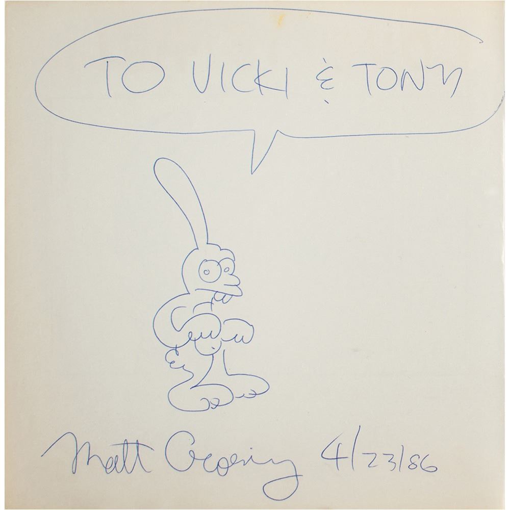 This delightfully early sketch of Bongo was drawn almost exactly a year before The Simpsons premiered on The Tracey Ullman Show (April 19, 1987), and more than three-and-a-half years before Springfield’s finest made their Fox network debut on December 17, 1989. Drawn in his first published book, this marks the earliest Groening sketch that we have ever offered.