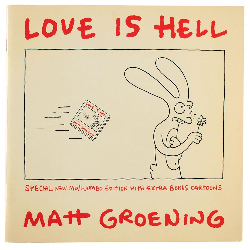 Signed book: Love Is Hell, ‘Special New Mini-Jumbo Edition.’ First Pantheon Edition. NY: Pantheon Books, 1985. Softcover, 9 x 9, 46 pages. Signed and inscribed on the inside front cover in blue ballpoint, "Matt Groening, 4/23/86," who adds an uncommon full-length sketch of the one-eared Bongo, the illegitimate son of Binky, with Groening adding a speech bubble inscription above, “To Vicki & Tony.†In fine condition, with trivial toning to cover.